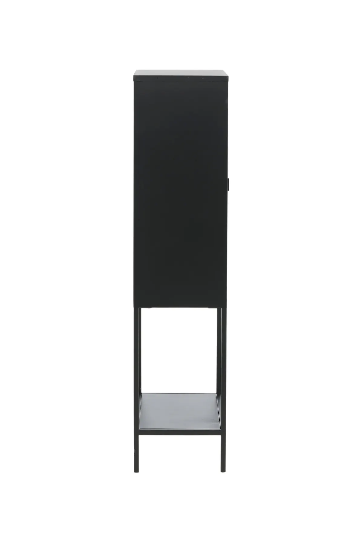 Ein elegantes Aufbewahrungsmöbel mit praktischem und stilvollem Design! Misha, im modernen nordischen Design mit geraden Strukturen, ist aus pulverbeschichtetem schwarzem Stahl mit zwei Glastüren für schönen Lichteinfall gefertigt. Der Schrank hat eine stattliche Höhe, die den Raum öffnet und eine trendige Atmosphäre schafft. Diese Vitrine ist auch sehr nützlich. Es gibt drei Einlegeböden, die Sie nach Ihren eigenen Bedürfnissen und Wünschen füllen können – schönes Porzellan, Bücher oder stilvolle Einrichtungsdetails – Sie haben die Wahl! Leichter Zusammenbau ist erforderlich.