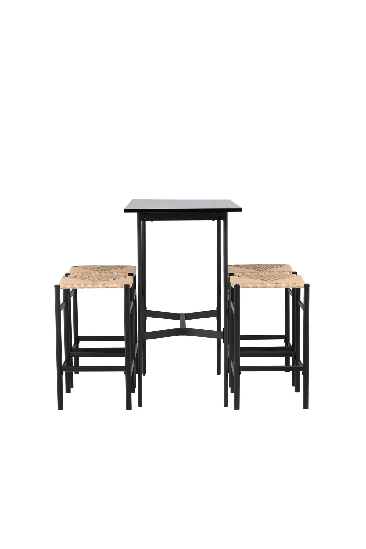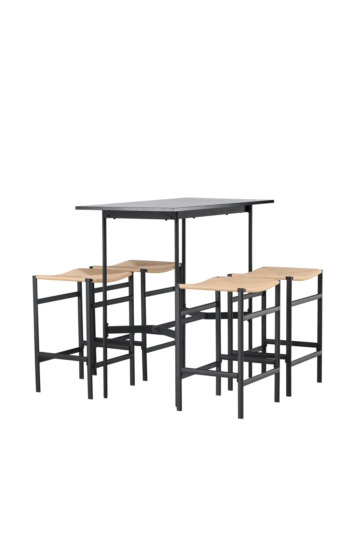 Eine stilvolle Kombination aus Bohème und Industriedesign! Der minimalistische Bartisch Rax hat eine dünne Tischplatte aus schwarzem MDF und schmale Tischbeine mit integrierter Fußstütze aus schwarzem Metall. Hier in Kombination mit modernen Barhockern aus der Serie Polly. Der Stuhl hat eine elegante Farbkombination mit einem Sitz aus naturfarbenem Seil und geraden Beinen mit integrierter Fußstütze aus schwarzem Gummibaumholz. Was für eine unglaubliche Kombination! Abmessungen des Tisches: 120x60cm.