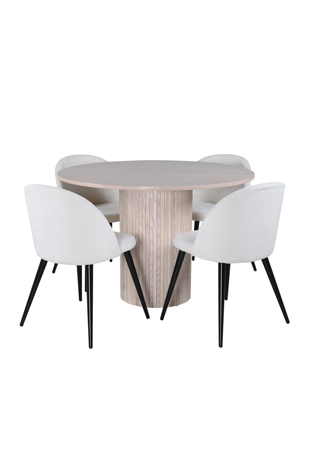 Sie müssen keine Kompromisse zwischen Stil und Komfort eingehen! Rund um unseren runden Esstisch Bianca schaffen Sie eine wunderbare Gemeinschaft, in der niemand Gefahr läuft, an den Rand zu geraten. Die Tischplatte ist aus MDF gefertigt und hat ein zylinderförmiges Gestell in robuster Ausführung und Rippenoptik. Die konsequent verputzte weiße Farbe ist ebenso zeitlos wie stilvoll und lässt sich gut mit anderen Dekoren kombinieren. Tischabmessungen: Durchmesser: 110cm, Höhe: 74cm. Hier zusammen mit 4 bequemen Esszimmerstühlen aus der Velvet-Serie. Die Stuhlbeine sind leicht ausgestellt in Eisen und die Sitzfläche beige in weichem Manchesterstoff. Stuhl Abmessungen: Höhe: 76,5cm, Sitzhöhe: 46,5cm, Breite: 50cm, Tiefe: 57cm. Lassen Sie das Herz Ihres Zuhauses von Ihrer neuen, auffälligen Essgruppe prägen.