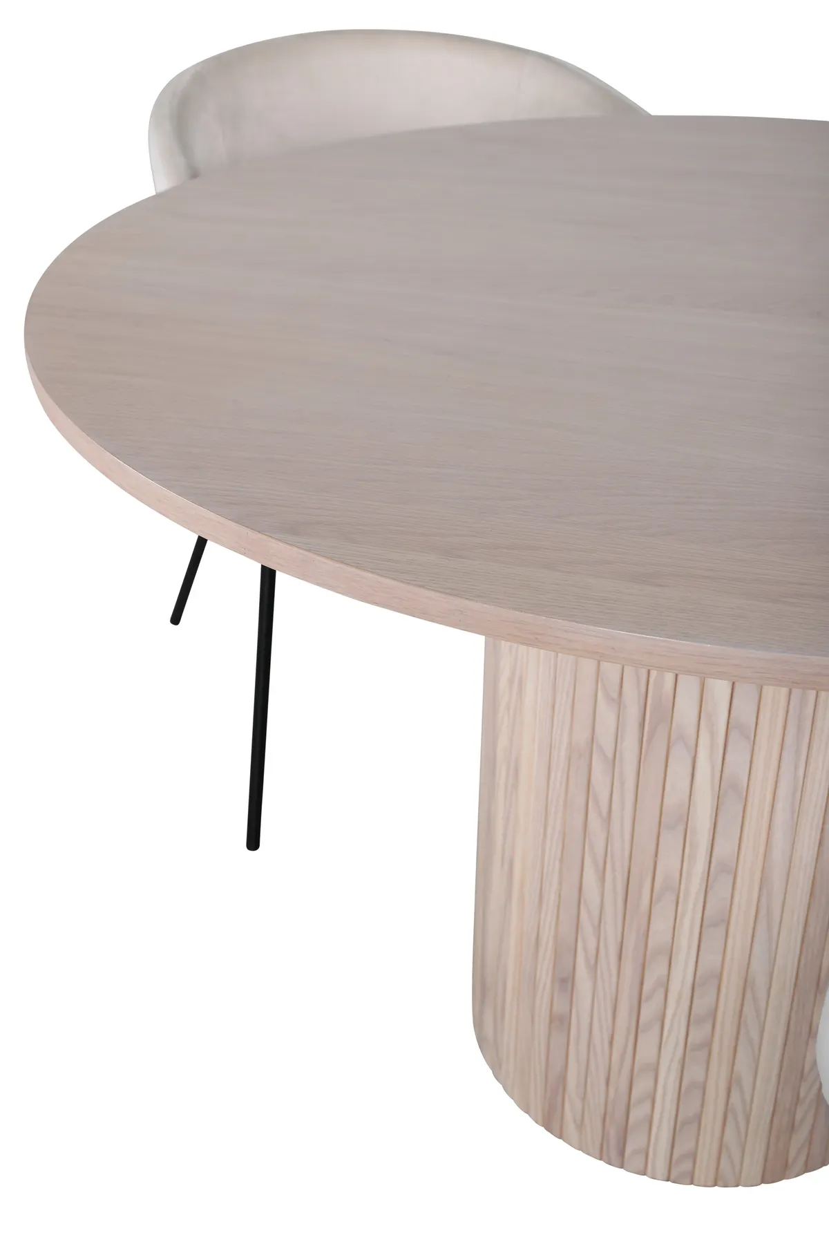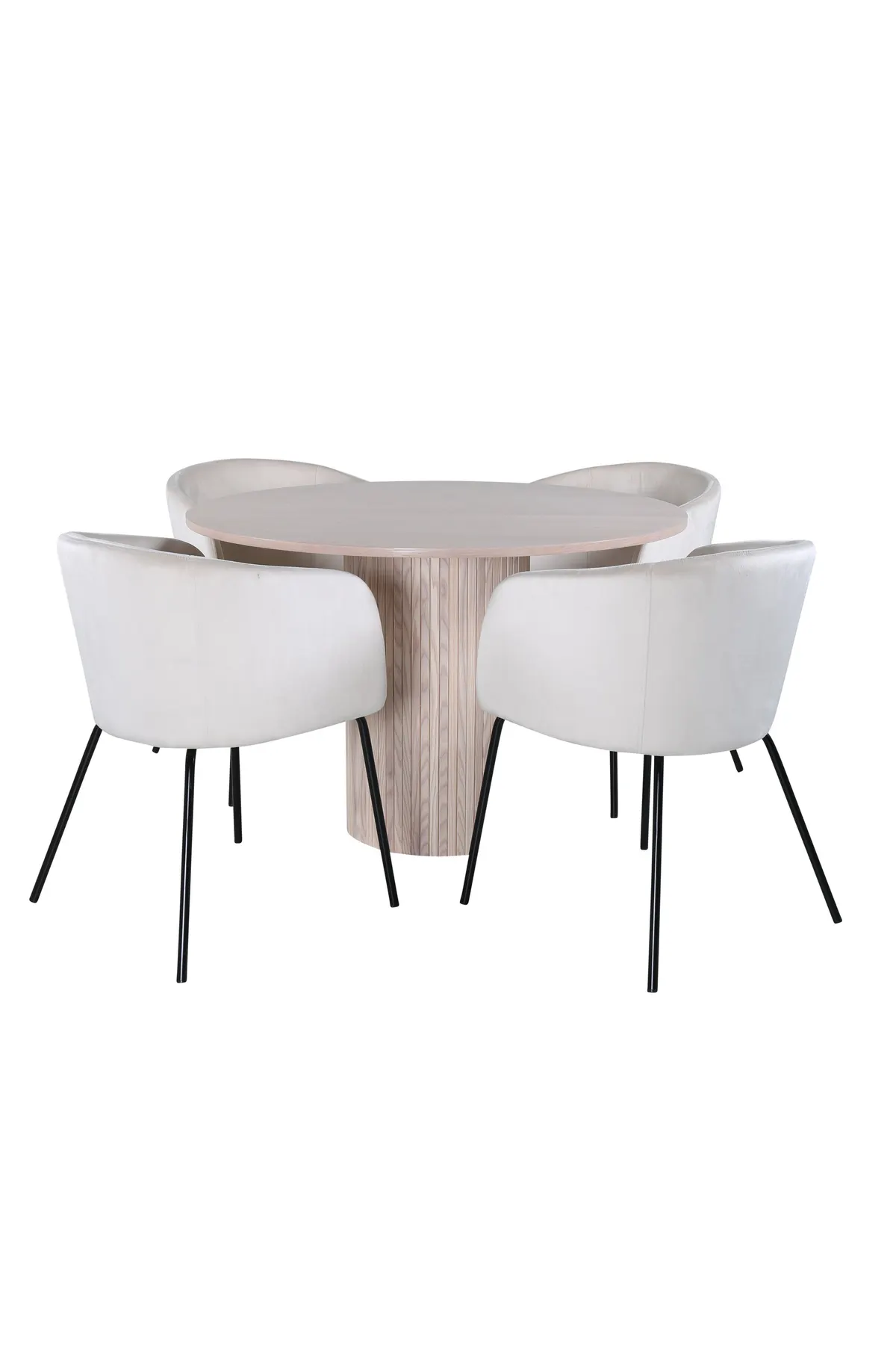 Schaffen Sie eine wunderbare Gemeinschaft um unseren runden Esstisch Bianca in modebewusstem Design! Die Tischplatte ist aus MDF gefertigt und hat ein zylinderförmiges Gestell in robuster Ausführung und Rippenoptik. Die konsequent verputzte weiße Farbe ist ebenso zeitlos wie stilvoll und lässt sich gut mit anderen Dekoren kombinieren. Tischabmessungen: Durchmesser: 110cm, Höhe: 74cm. Hier kombiniert mit 4 Berit Esszimmerstühlen in luxuriösem Design. Das pompöse Design der Stühle mit einem beigen Sitz aus weichem Samtstoff und die schmalen Hocker aus Eisen schaffen eine einladende Atmosphäre. Maße der Stühle: Höhe: 78cm, Sitzhöhe: 49cm, Breite: 55cm, Tiefe: 55cm.