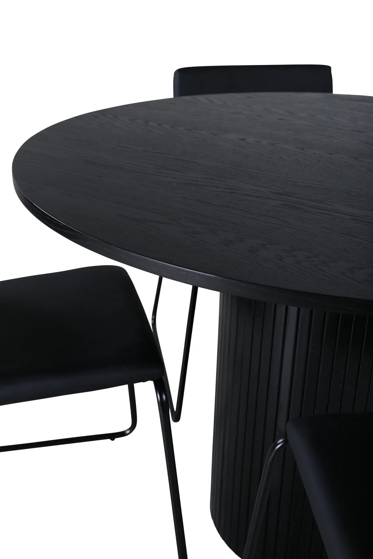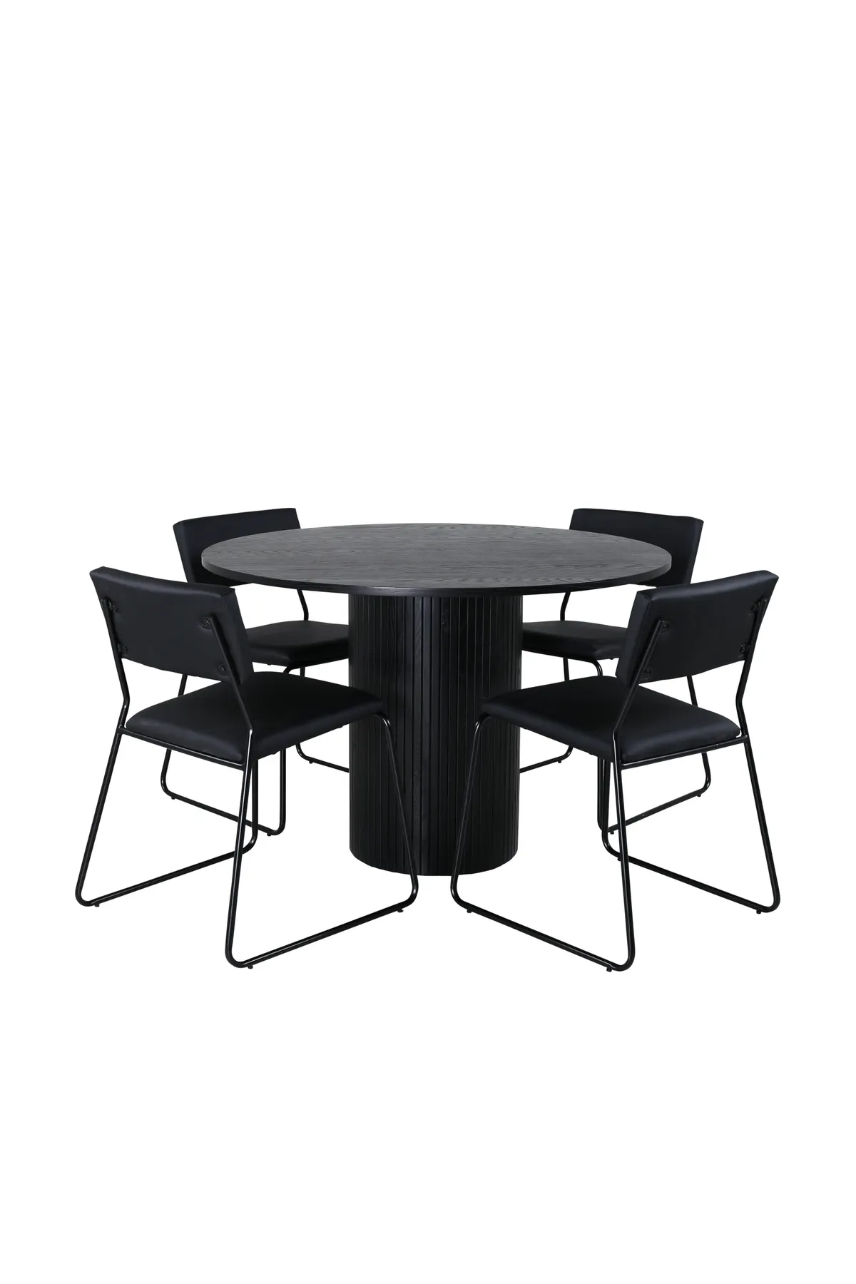 Die perfekte Kombination aus Robustheit und Minimalismus! Rund um unseren runden Esstisch Bianca schaffen Sie eine wunderbare Gemeinschaft, bei der niemand Gefahr läuft, an den Rand zu geraten. Die Tischplatte ist aus MDF gefertigt und hat ein zylinderförmiges Gestell in massiver Ausführung und Rippendesign. Die durchgängig schwarze Farbe ist ebenso zeitlos wie stilvoll und lässt sich gut mit anderen Einrichtungen kombinieren. Tischabmessungen: Durchmesser: 110cm, Höhe: 74cm. Kombiniert hier mit 4 unserer schicken Esszimmerstühle Kenth in schwarzem Kunstleder und Hockerbeinen aus Eisen. Stuhl Abmessungen: Höhe: 76cm, Sitzhöhe: 48,5cm, Breite: 40cm, Tiefe: 52cm.