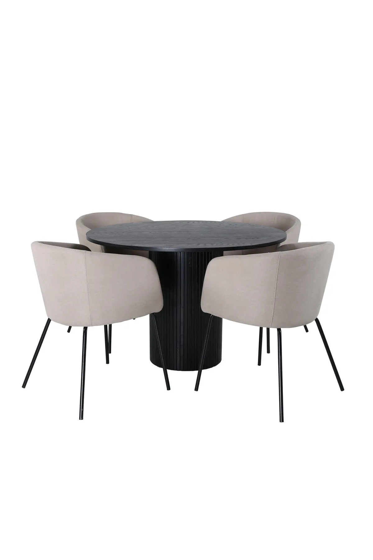 Richten Sie das Wohnzimmer charmant und einladend mit einer runden Essgruppe ein! Rund um unseren runden Esstisch Bianca schaffen Sie eine wunderbare Gemeinschaft, bei der niemand Gefahr läuft, an den Rand zu geraten. Die Tischplatte ist aus MDF gefertigt und hat ein zylinderförmiges Gestell in robuster Ausführung und Rippendesign. Die durchgängig schwarze Farbe ist ebenso zeitlos wie stilvoll und lässt sich gut mit anderen Einrichtungen kombinieren. Tischabmessungen: Durchmesser: 110cm, Höhe: 74cm. Gut kombinierbar mit 4 Berit Esszimmerstühlen in luxuriösem Design. Die Sitzfläche ist pompös in beigem Polyesterleinen und die Stuhlbeine schmal in schwarzem Eisen. Stuhl Abmessungen: Höhe: 78cm, Sitzhöhe: 49cm, Breite: 55cm, Tiefe: 55cm.