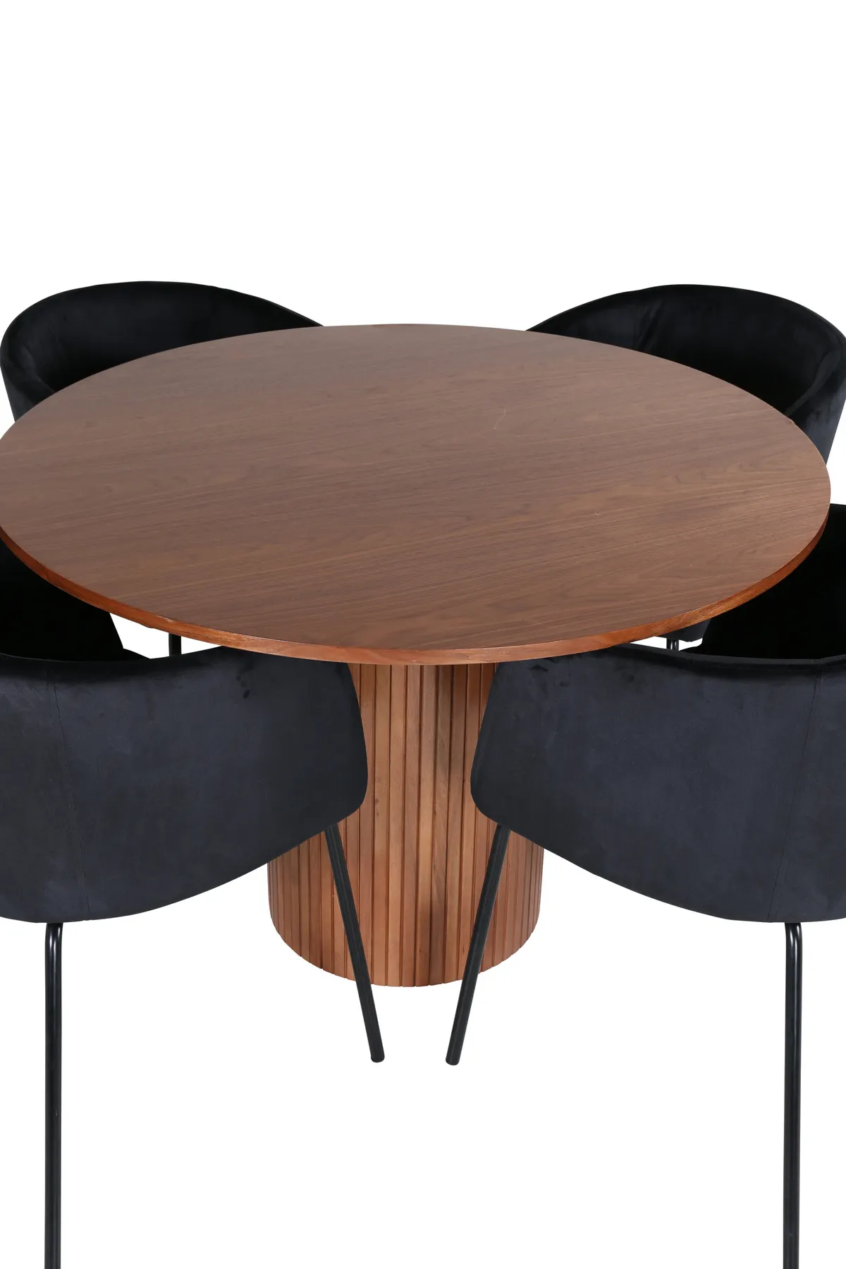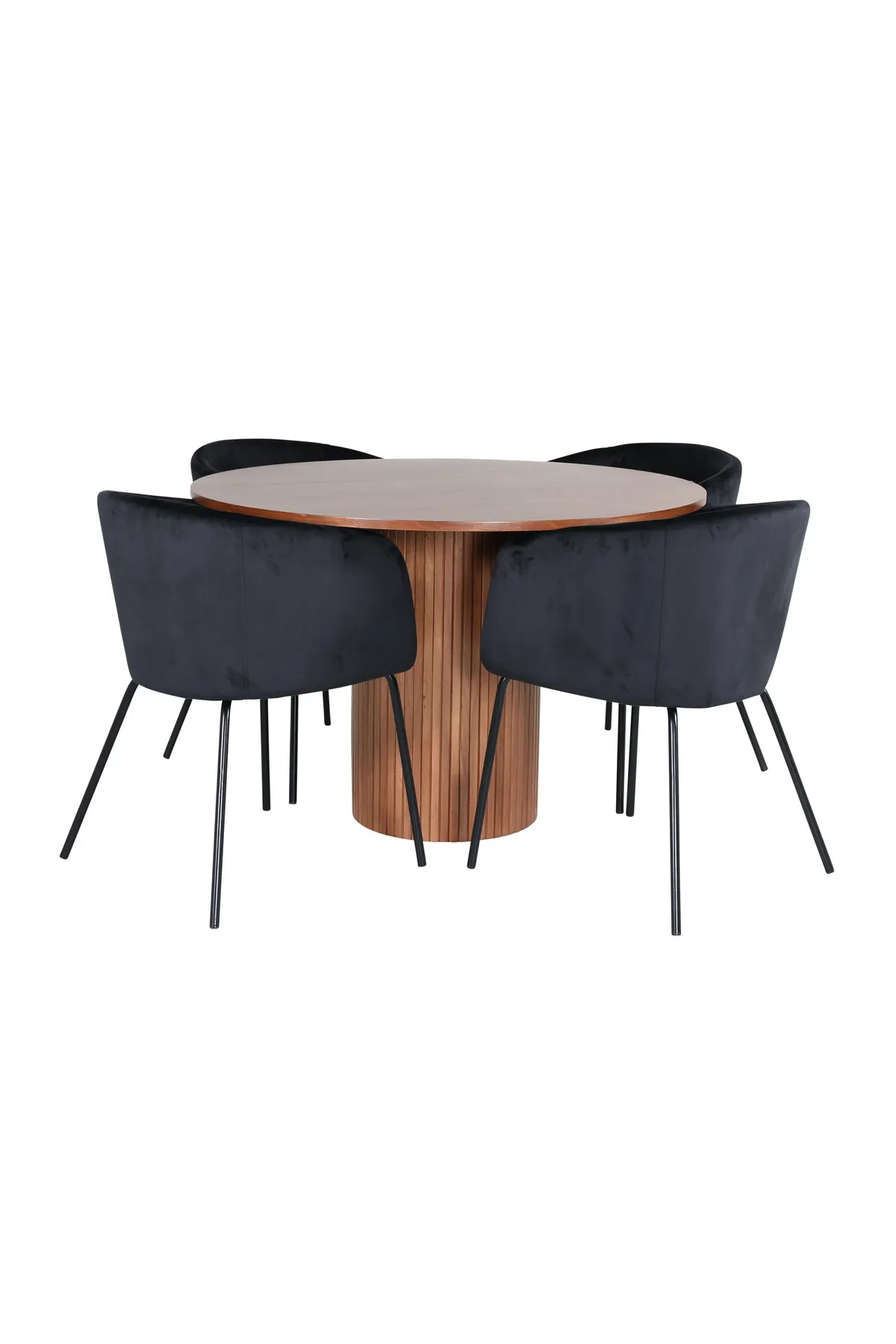 Pompös und elegant – verleihen Sie Ihrem Interieur einen modernen Touch! Unser runder Esstisch Bianca in trendigen Walnussfarben passt perfekt sowohl ins Wohnzimmer als auch in die geräumige Küche. Die Tischplatte ist aus nussbaumfarbenem MDF mit Furnieren und der Korpus stabil in nussbaum- sowie schwarzer Holz- und MDF-Farbe in einem Rippendesign, das einen stabilen Eindruck vermittelt. Hier zusammen mit 4 Berit Esszimmerstühlen in luxuriösem Design. Die Sitzfläche ist weich in schwarzem Samt und die Stuhlbeine stilvoll schmal in schwarzem Eisen. Schaffen Sie einen einladenden Blickfang im Herzen Ihres Zuhauses!