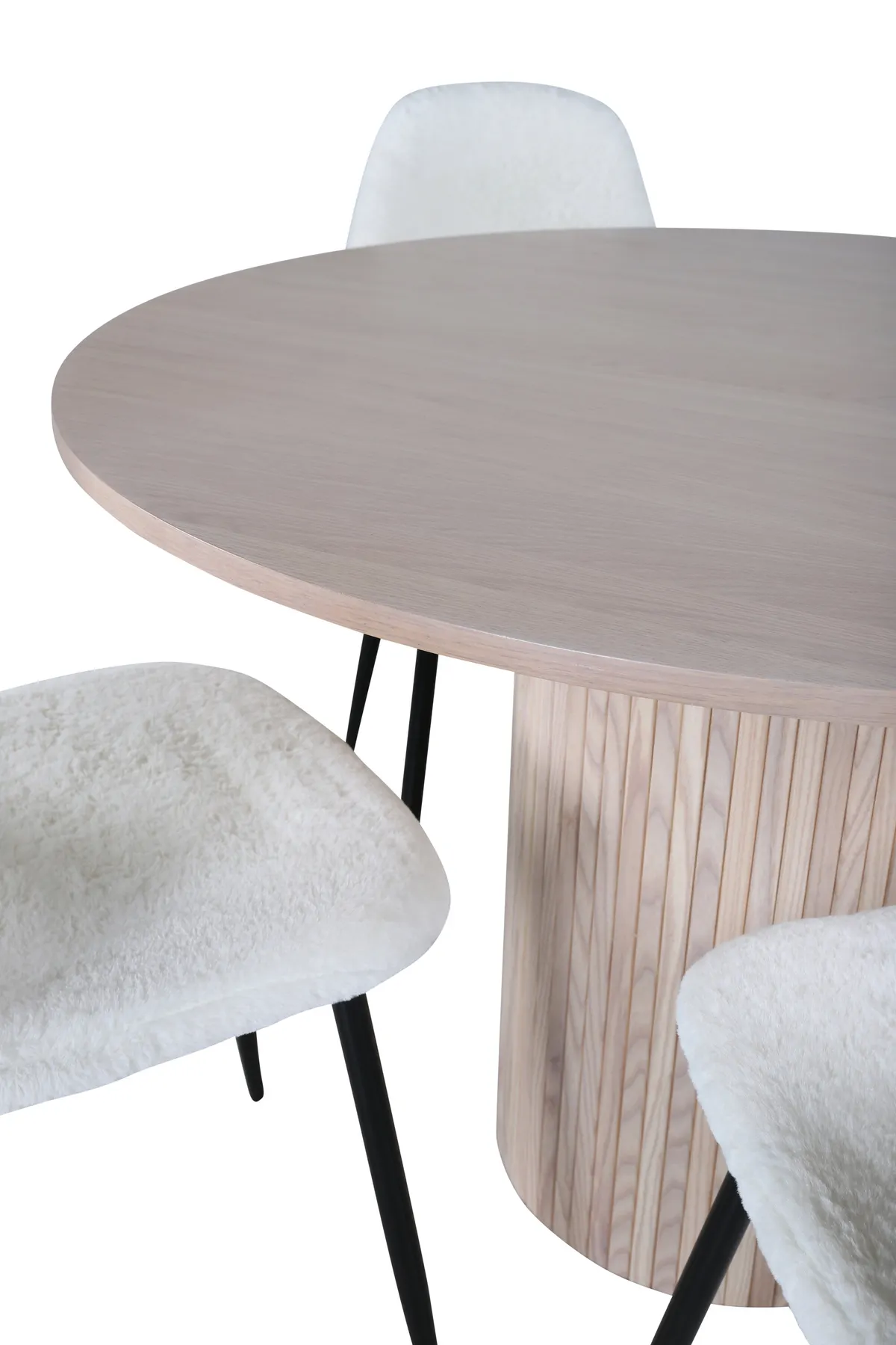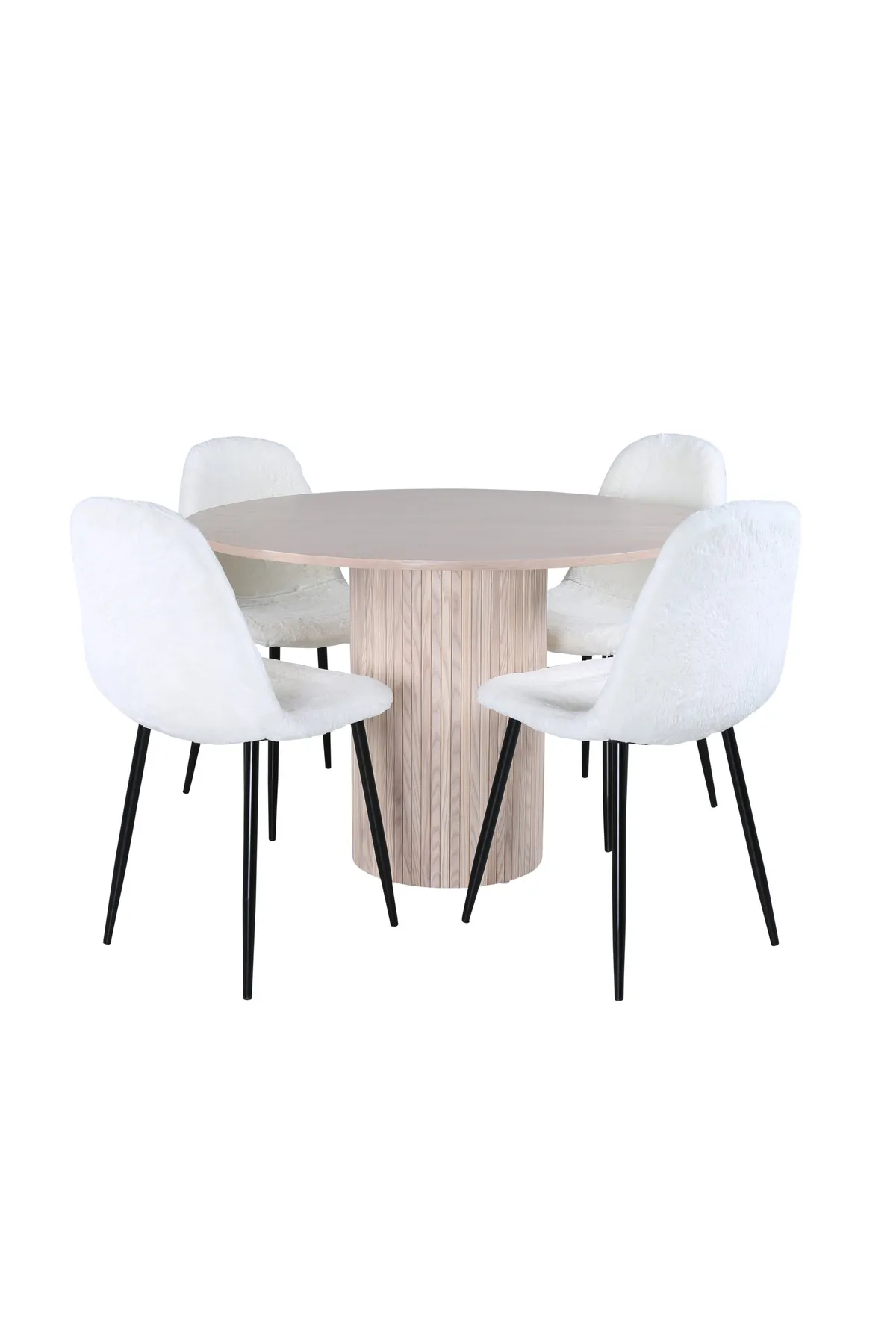 Richten Sie das Wohnzimmer modern und gemütlich mit einer charmanten runden Essgruppe ein! Um unseren Esstisch Bianca schaffen Sie eine wunderbare Gemeinschaft, bei der niemand Gefahr läuft, an den Rand zu geraten. Die Tischplatte ist aus MDF gefertigt und hat ein zylinderförmiges Gestell in robuster Ausführung und Rippendesign. Die konsequent verputzte weiße Farbe ist ebenso zeitlos wie stilvoll und lässt sich gut mit anderen Einrichtungen kombinieren. Tischabmessungen: Durchmesser: 110cm, Höhe: 74cm. Hier in köstlicher Kombination von 4 weißen Polar Esszimmerstühlen im beliebten Teddy-Stoff mit ausgestellten Stuhlbeinen aus schwarzem Metall. Stuhl-Maße: Höhe: 87cm, Sitzhöhe: 45,5cm, Breite: 44cm, Tiefe: 53cm.