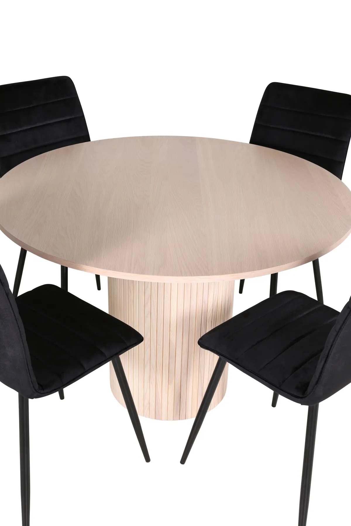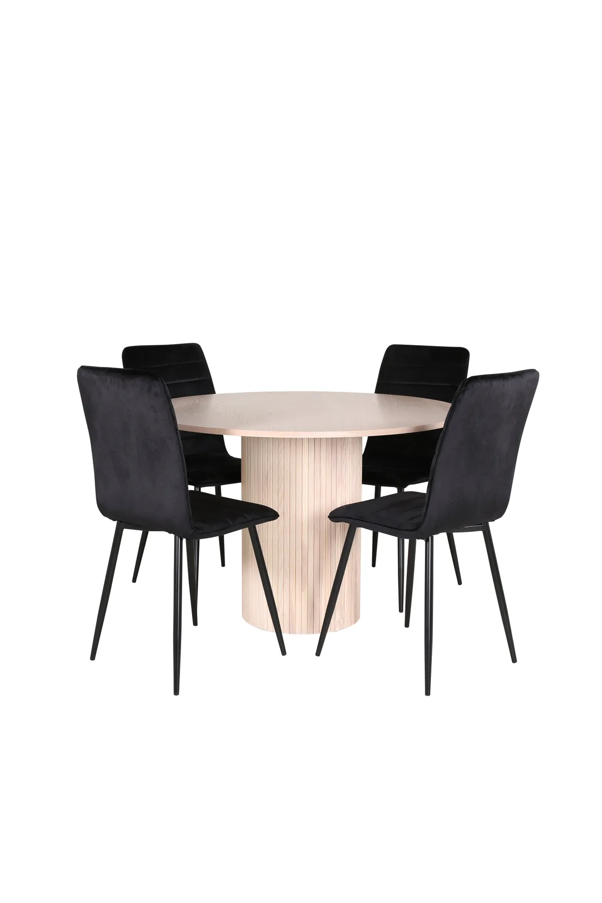 Lassen Sie die Zeit am Esstisch zu einem der Höhepunkte des Tages werden! Rund um unseren runden Esstisch Bianca schaffen Sie eine wunderbare Gemeinschaft, bei der niemand Gefahr läuft, an den Rand zu geraten. Die Tischplatte ist aus MDF gefertigt und hat ein zylinderförmiges Gestell in robuster Ausführung und Rippendesign. Die konsequent verputzte weiße Farbe ist ebenso zeitlos wie stilvoll und lässt sich gut mit anderen Dekoren kombinieren. Hier zusammen mit 4 Windu Luxus-Esszimmerstühlen in frecher schwarzer Farbe. Die Sitzfläche ist aus schwarzem Samtstoff, der einen schönen Glanz verleiht und die Stuhlbeine sind aus schwarzem Eisen. Vergolden Sie alle Mahlzeiten des Tages um eine schöne Essgruppe!
