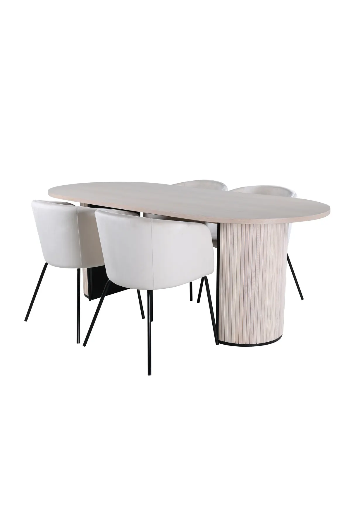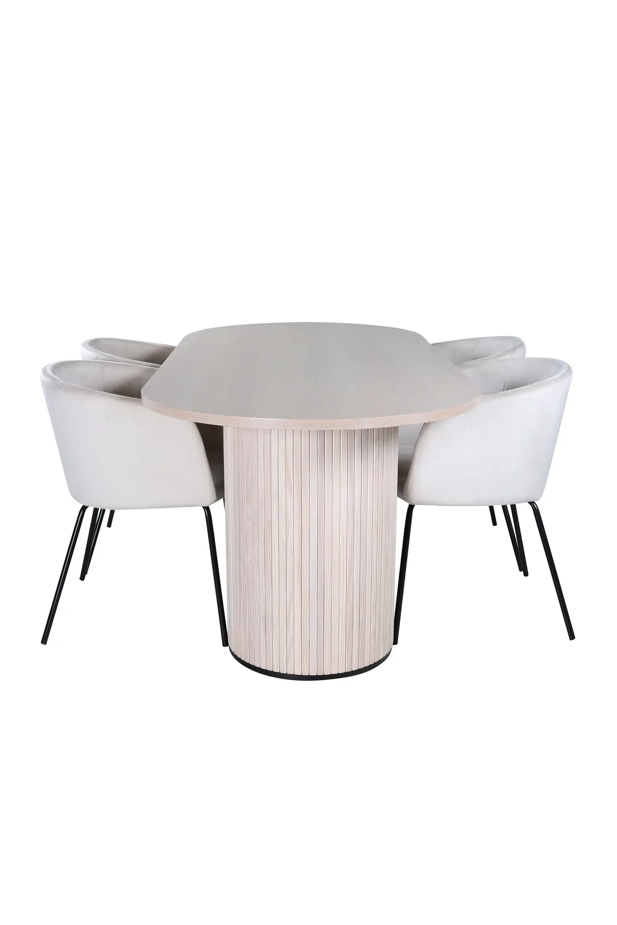 Bianca schafft einen stilvollen Blickfang, der beeindruckt! Dieser ovale Esstisch in verputztem Weiß hat ein modernes Design mit einer Tischplatte aus knochenweißem MDF mit Furnieren und einem robusten Gestell aus Holz und MDF im Rippendesign, das einen stabilen Eindruck vermittelt. Abmessungen des Tisches: Länge: 200cm, Breite: 90cm, Höhe: 75cm. Hier zusammen mit 4 unserer stilvollen Esszimmerstühle Berit in einladendem Design. Die Stühle setzen auf Komfort mit einer weichen Sitzfläche aus beigem Samtstoff und stilvollen schmalen Stuhlbeinen aus schwarzem Eisen. Maße der Stühle: Höhe: 78cm, Sitzhöhe: 49cm, Breite: 55cm, Tiefe: 55cm
