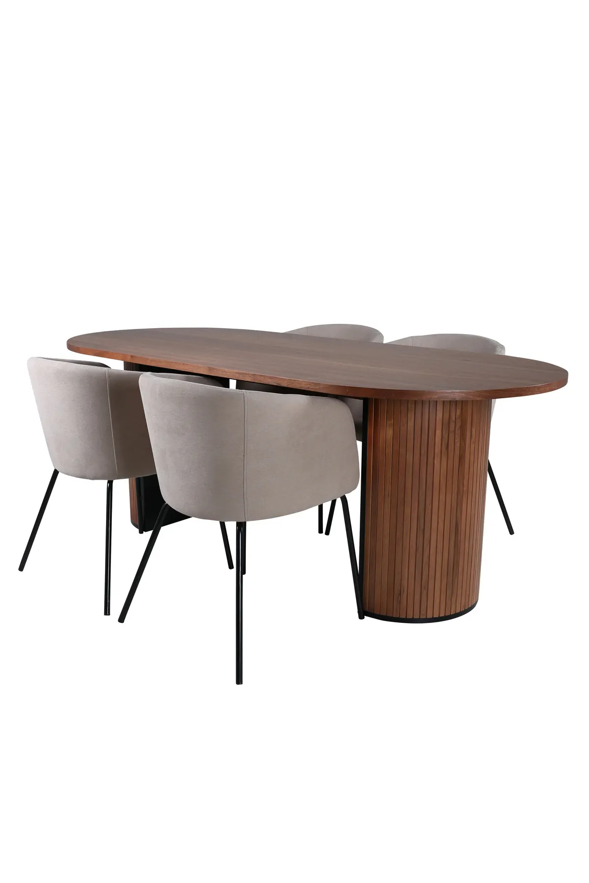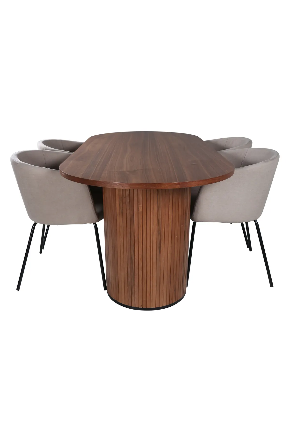 Pompös und elegant – verleihen Sie Ihrem Interieur einen modernen Touch! Unser ovaler Esstisch Bianca in trendigen Walnussfarben passt perfekt sowohl ins Wohnzimmer als auch in die geräumige Küche. Die Tischplatte ist aus nussbaumfarbenem MDF mit Furnieren und der Korpus stabil in Nussbaum- sowie schwarzer Holz- und MDF-Farbe in einem Rippendesign, das einen stabilen Eindruck vermittelt. Maße des Tisches: Länge: 200cm, Breite: 90cm, Höhe: 75cm. Dazu passen 4 Berit Esszimmerstühle in luxuriösem Design. Die Sitzfläche ist weich in beigem Polyesterleinen und die Stuhlbeine stilvoll schmal in schwarzem Eisen. Maße der Stühle: Höhe: 78cm, Sitzhöhe: 49cm, Breite: 55cm, Tiefe: 55cm. Schaffen Sie einen einladenden Blickfang im Herzen Ihres Zuhauses!