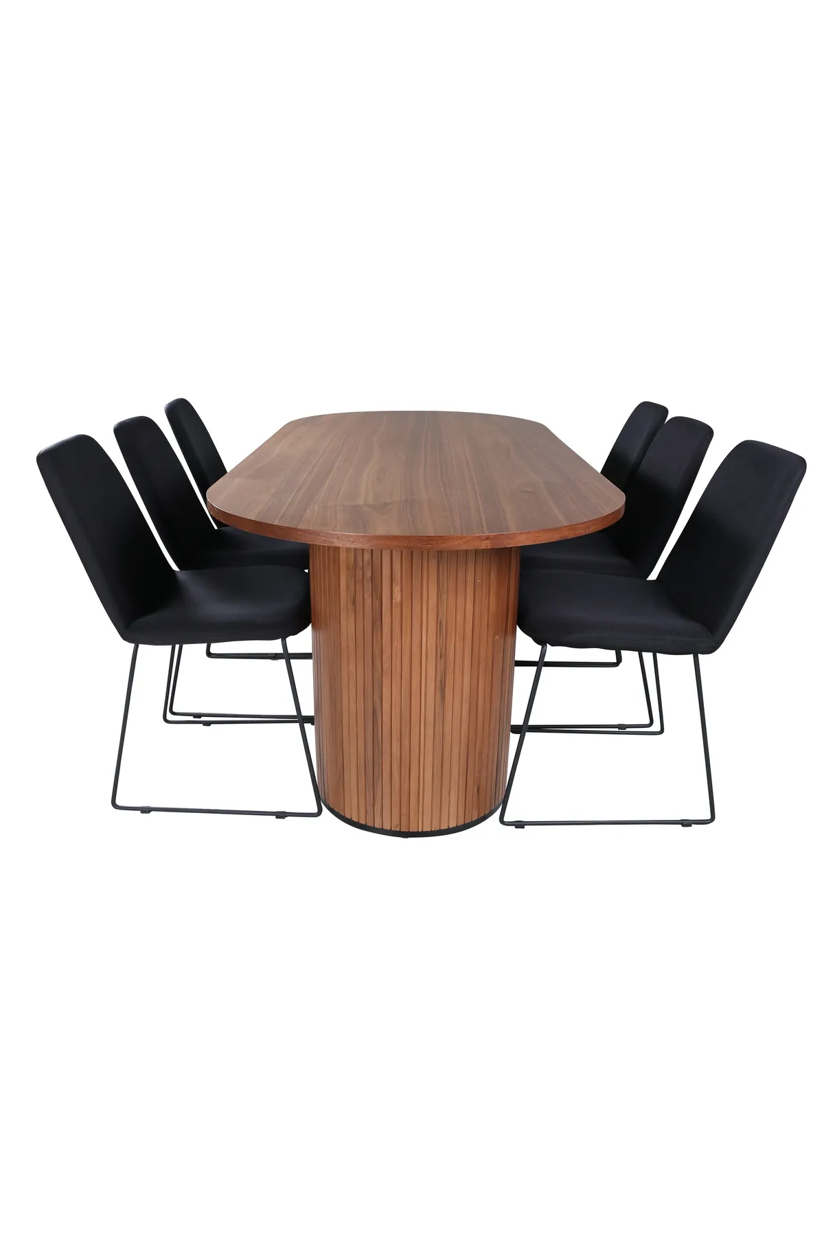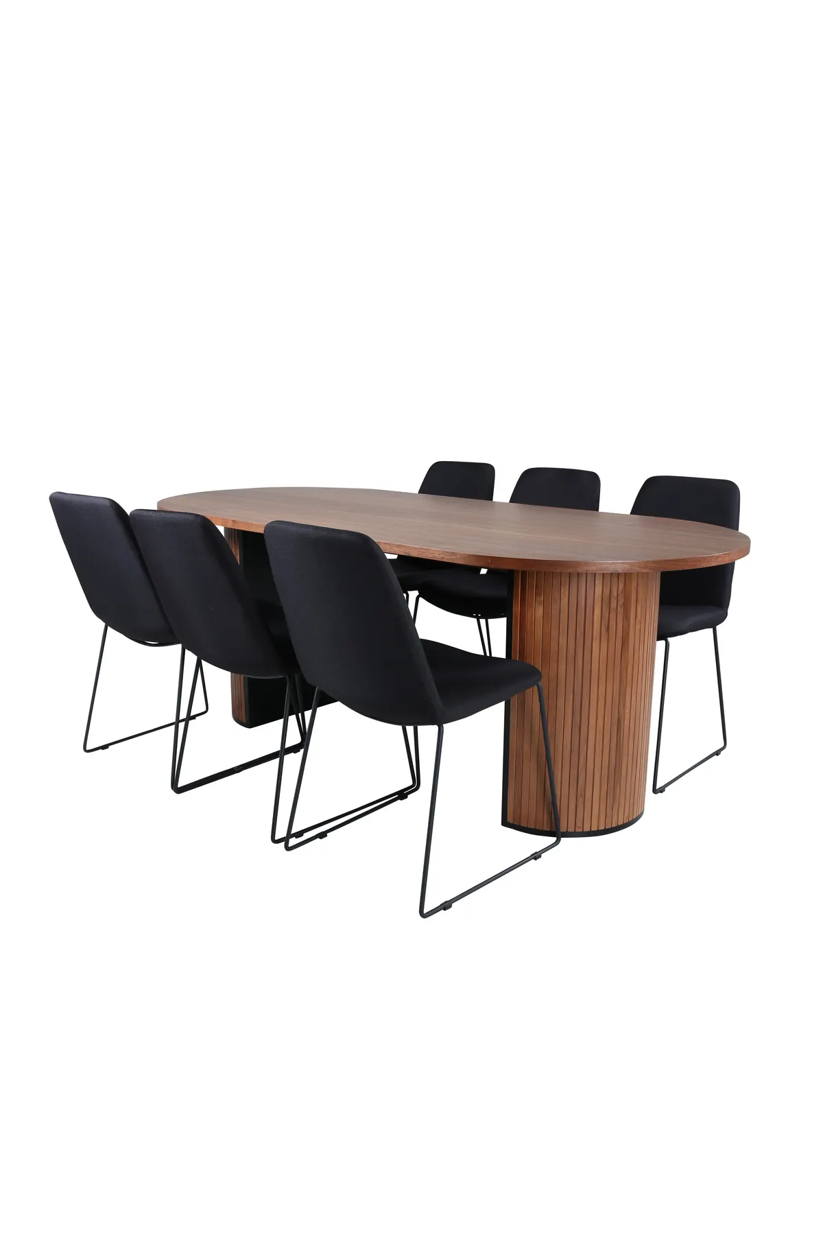 Kombinieren Sie robustes Design mit stilvollem Minimalismus! Unser ovaler Esstisch Bianca in trendigen Walnussfarben passt perfekt sowohl ins Wohnzimmer als auch in die geräumige Küche. Die Tischplatte ist aus walnussfarbenem MDF mit Furnieren und der Korpus robust in Walnuss sowie schwarzer Holz- und MDF-Farbe in einem gerippten Design, das einen stabilen Eindruck vermittelt. Maße des Tisches: Länge: 200cm, Breite: 90cm, Höhe: 75cm. Hier zusammen mit 6 unserer beliebten Muce Esszimmerstühle. Die Stuhlbeine sind stilvoll schmal in schwarzem Metall und der bequeme Sitz in schwarzem Polyester. Stuhl-Maße: Höhe: 84cm, Sitzhöhe: 47cm, Breite: 43cm, Tiefe: 63cm.