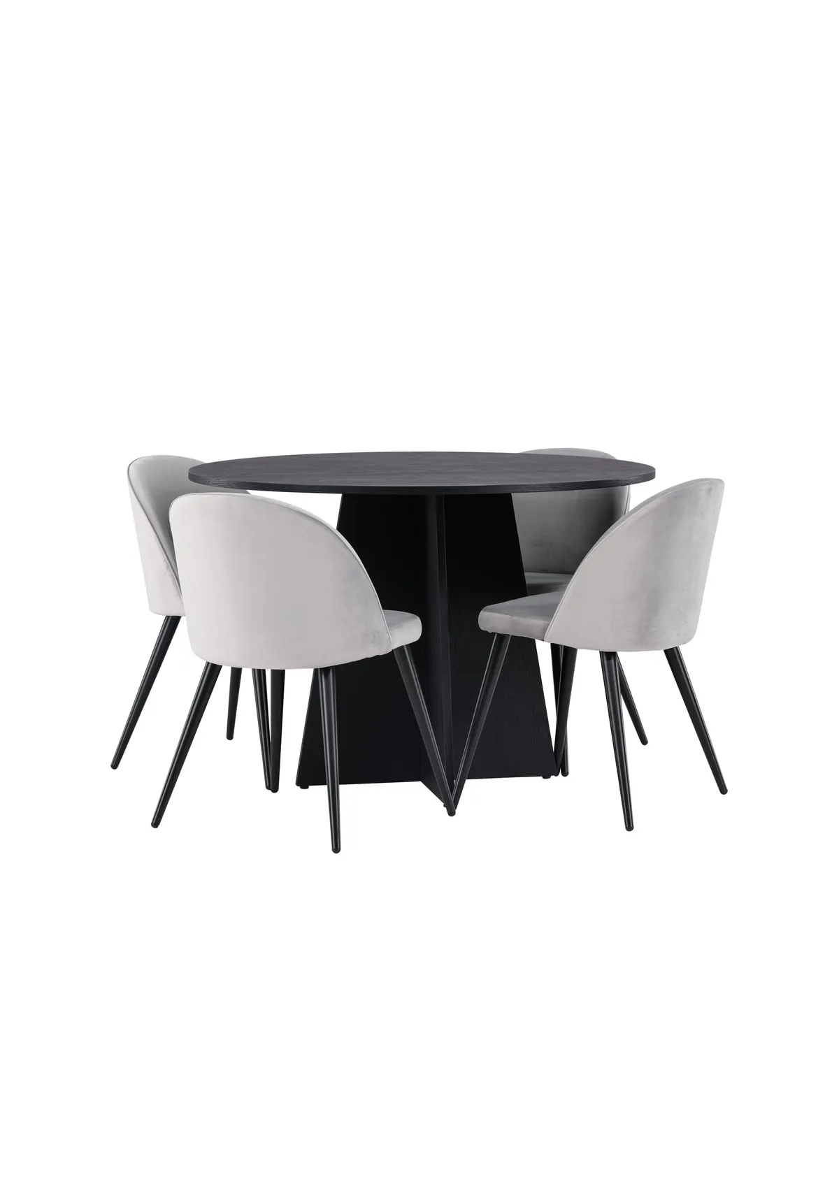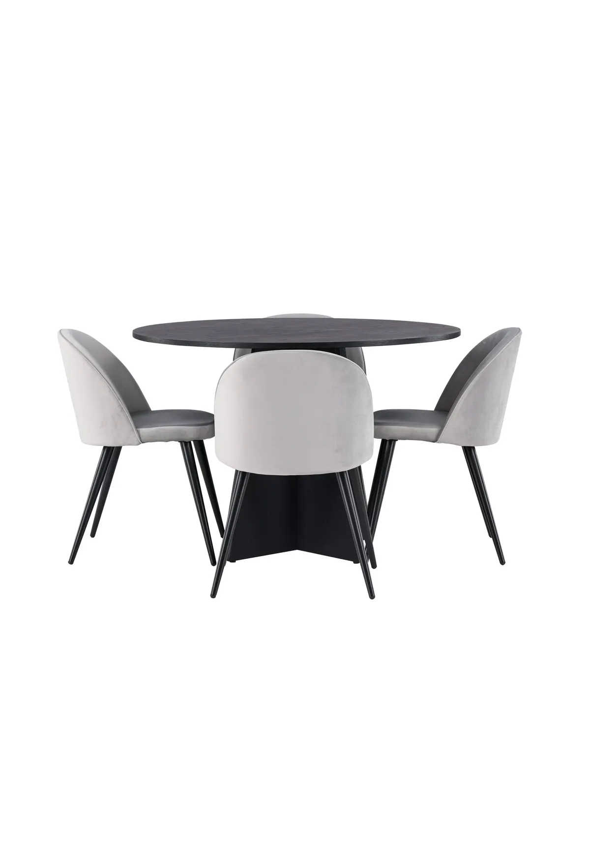 Eine angenehme Essgruppe in geschmackvollem, skandinavischem Design! Der runde Esstisch Bootcut in konsequent schwarzer Farbe hat eine Tischplatte aus MDF mit Furnier und ein designreiches Gestell, das dem Gesamtbild einen schönen Eindruck verleiht. Hier in perfekter Kombination mit unseren grauen Esszimmerstühlen aus der Velvet-Serie. Der Stuhl hat ein vollgepolstertes Design, Beine aus schwarz pulverbeschichtetem Metall und eine abgerundete Rückenlehne und Sitzfläche aus grauem Samtstoff mit weicher Polsterung. Ebenso stilvoll wie bequem! Abmessungen des Tisches: 110cm.