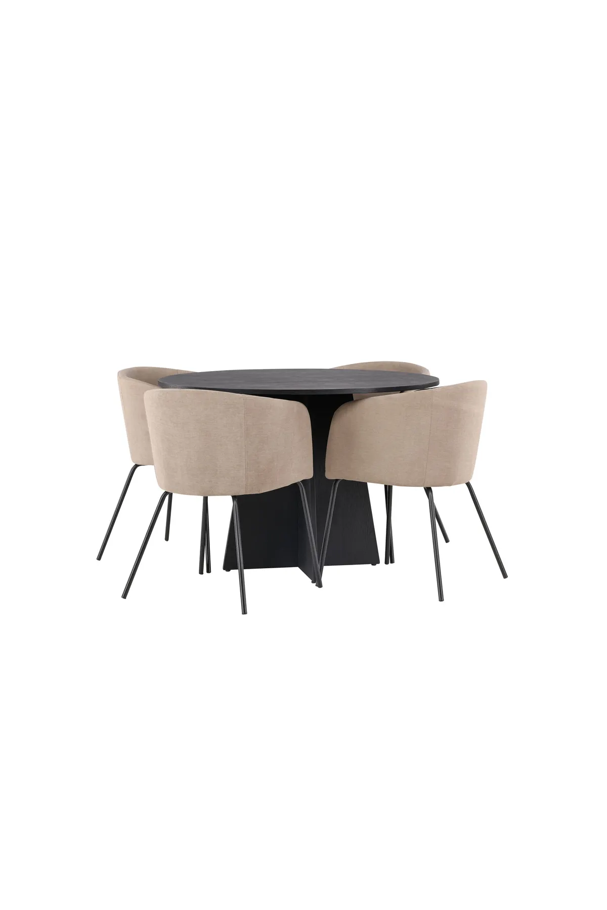 Eine geschmackvolle Kombination aus Komfort und charmanten Formen! Der runde Esstisch Bootcut in konsequent schwarzer Farbe hat eine Tischplatte aus MDF mit Furnier und ein designreiches Gestell, das dem Gesamtbild einen schönen Eindruck verleiht. Hier zusammen mit unseren bequemen Esszimmerstühlen Berit. Der Stuhl hat eine Vollpolsterung mit leicht gerundeter Rückenlehne und Sitzfläche in Samtstoff und Polyesterleinen sowie schmale Beine aus schwarzem Eisen. Lassen Sie die Zeit hier zu einem Vergnügen für die ganze Familie werden! Abmessungen des Tisches: 110cm.