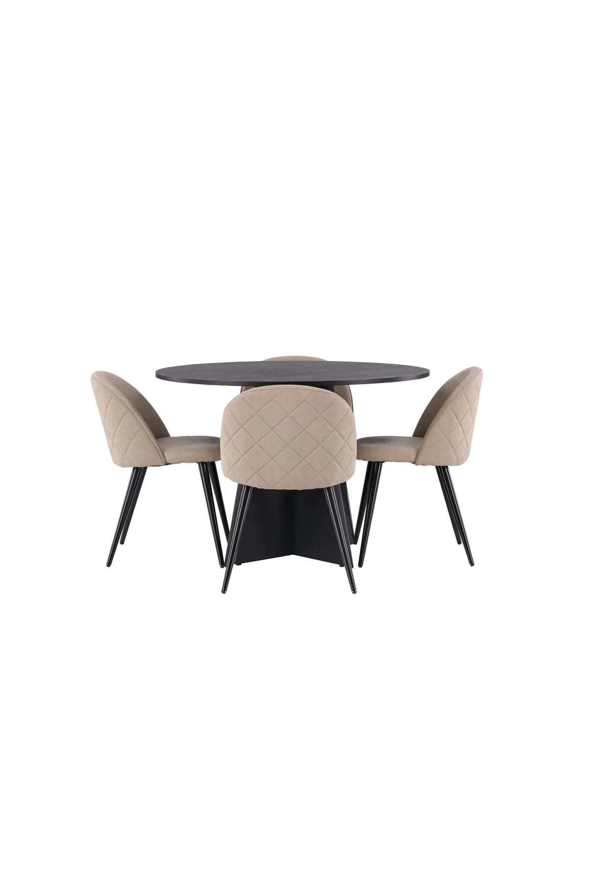 Schaffen Sie einen Blickfang, der beeindruckt! Der runde Esstisch Bootcut in konsequent schwarzer Farbe hat eine Tischplatte aus MDF mit Furnier und ein designreiches Gestell, das dem Gesamtbild einen schönen Ausdruck verleiht. Hier in trendgerechter Kombination mit Esszimmerstühlen aus der Serie Velvet Stitches. Die Rückenlehne des Stuhls ist abgerundet und ebenso wie die Sitzfläche weich mit beigem Samt und Polyesterleinen gepolstert, mit dekorativen Ziernähten und Schachbrettmuster auf der Rückseite. Die Beine aus schwarzem Eisen sind leicht ausgestellt und vermitteln einen stabilen Eindruck. Hier erhalten Sie eine geschmackvolle Kombination aus Stil und Komfort! Abmessungen des Tisches: 110cm.