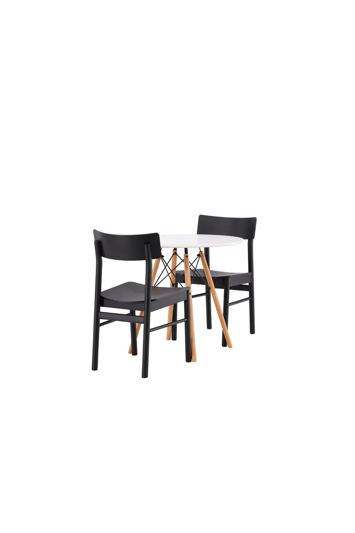 Eine komplette Essgruppe für zwei Personen! Der runde Esstisch Danburi hat ein klassisches Design mit einer runden Tischplatte aus weißem MDF und leicht ausgestellten Beinen aus Buchenholz mit dekorativen Details aus schwarzem Stahl. Hier in geschmackvoller Kombination mit modernen Esszimmerstühlen aus der Serie Montros. Der Stuhl hat ein klassisches und nostalgisches Design mit geraden nordischen Formen, hergestellt aus schwarzem Gummibaumholz. Ein langlebiges Esszimmer-Set! Tisch-Durchmesser: 60cm.
