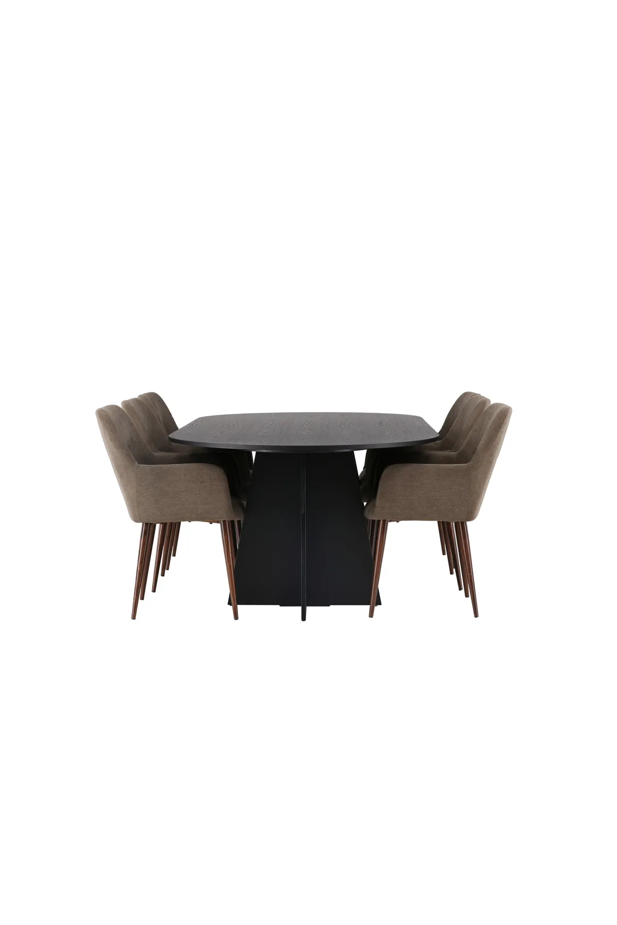Unser ovaler Esstisch aus der Serie Bootcut ist etwas ganz Besonderes. Mit seiner ovalen Tischplatte aus schwarzem MDF mit Furnier und einem stabilen Gestell mit zwei angepassten Beinen in offener Form hebt er sich von der Masse ab. Diese einzigartige Kombination verleiht dem Tisch einen Hauch von Größe und Eleganz. Die Abmessungen des Tisches sind 115x230cm.