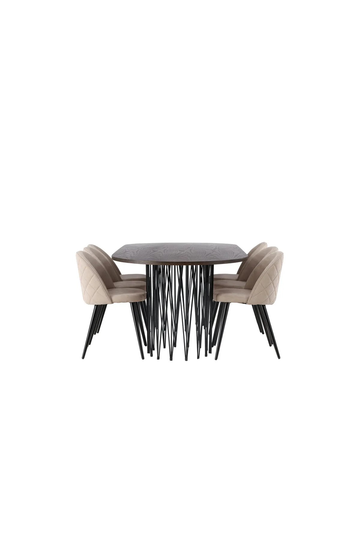 Eine wunderbare Kombination aus hohem Komfort und modernen Formen! Unser ovaler Esstisch Stone besticht durch sein modebewusstes Design. Der Tisch hat eine schöne braunfarbene Tischplatte aus MDF mit Furnier und zwei dekorative zylindrische Gestelle aus schwarzem Metall. Hier in trendiger Kombination mit Esszimmerstühlen aus der Serie Velvet Stitches. Die Rückenlehne des Stuhls ist abgerundet und ebenso wie die Sitzfläche weich mit beigem Polyster-Leinen gepolstert, das mit dekorativen Ziernähten und einem Schachbrettmuster auf der Rückseite versehen ist. Die Beine sind leicht ausgestellt und aus schwarzem Eisen. Richten Sie Ihr Zuhause trendbewusst ein! Tischabmessungen: 220x100cm.