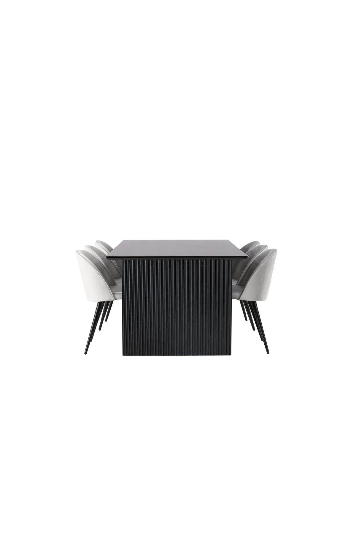 Eine angenehme Farbkombination! Der rechteckige Esstisch Vail hat geradlinige nordische Formen und ist aus strapazierfähigem MDF in einem rußigen Schwarz gefertigt. Die Tischplatte ist dünn in einem rechteckigen Design und balanciert auf zwei stabilen Holzplatten, die das Untergestell bilden. Hier in perfekter Kombination mit unseren grauen Esszimmerstühlen aus der Velvet-Serie. Der Stuhl hat ein vollgepolstertes Design, Beine aus schwarz pulverbeschichtetem Metall und eine abgerundete Rückenlehne und Sitzfläche aus grauem Samtstoff mit weicher Polsterung. Hier können Sie und Ihre Gäste lange Zeit bequem sitzen! Abmessungen des Tisches: 200x100cm.