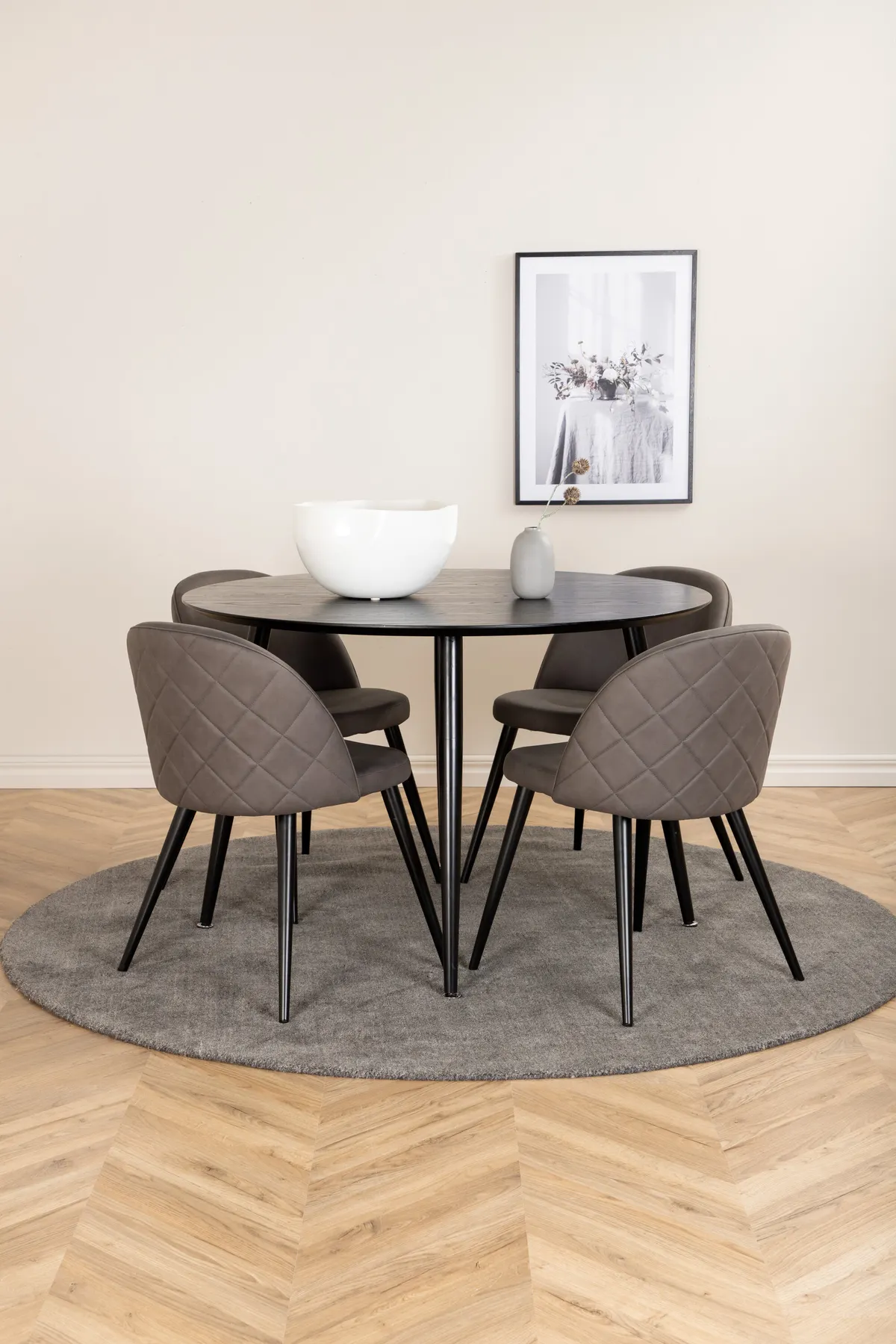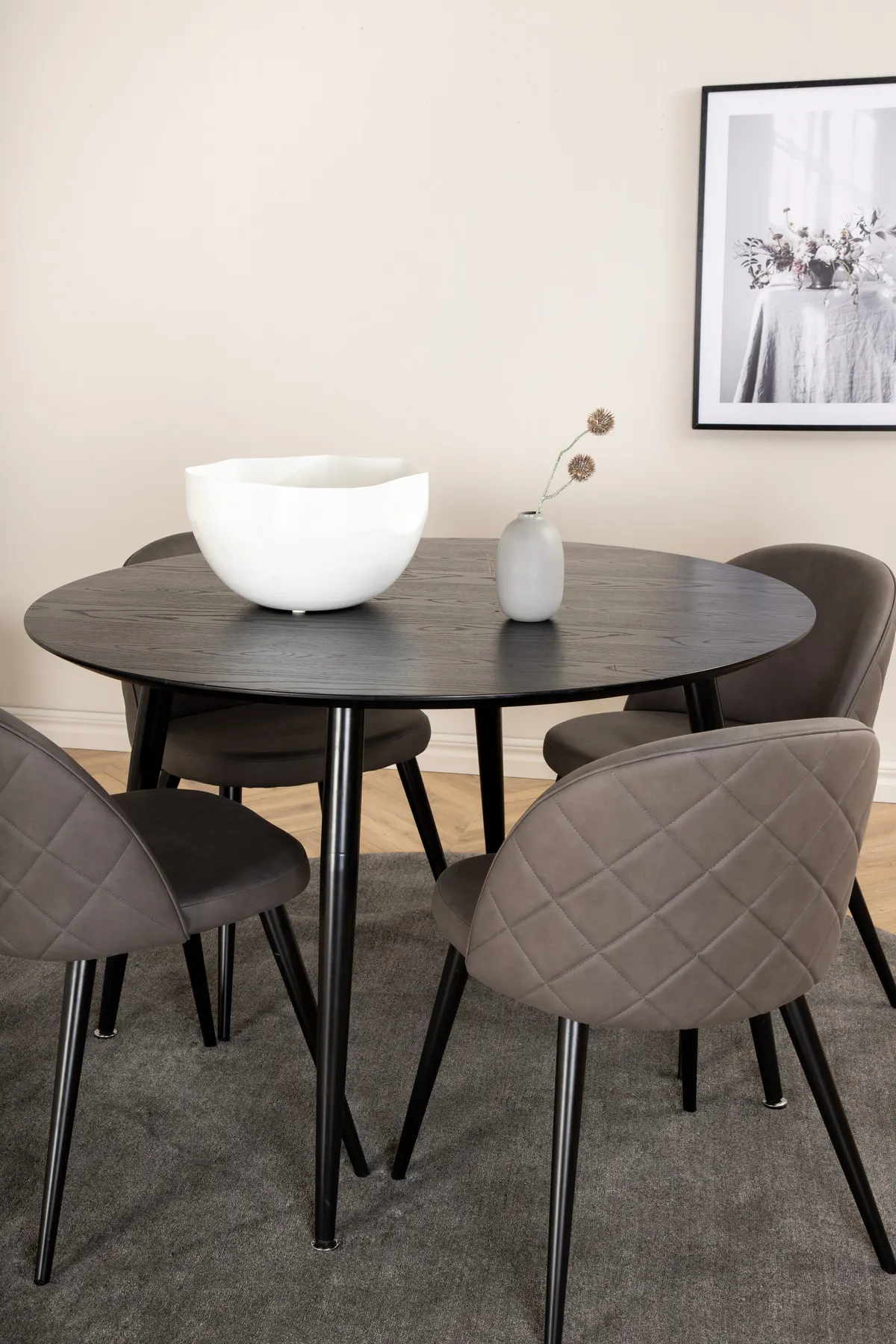 Schaffen Sie einen charmanten Mittelpunkt, um den Sie und Ihre Familie sich versammeln können! Unser runder Esstisch der Serie Dip hat eine stilvolle Tischplatte aus MDF und leicht ausgestellte Tischbeine aus Metall. Der Tisch ist durchgehend in schwarzer Farbe gehalten, was dem Raum ein modernes und luxuriöses Gefühl verleiht. Hier zusammen mit Matten aus der Serie Velvet Stitches in grauer Mikrofaser. Die Stuhlbeine sind leicht ausgestellt in schwarzem Eisen und passen hervorragend zum Tisch. Genießen Sie in Zukunft angenehme Mahlzeiten!