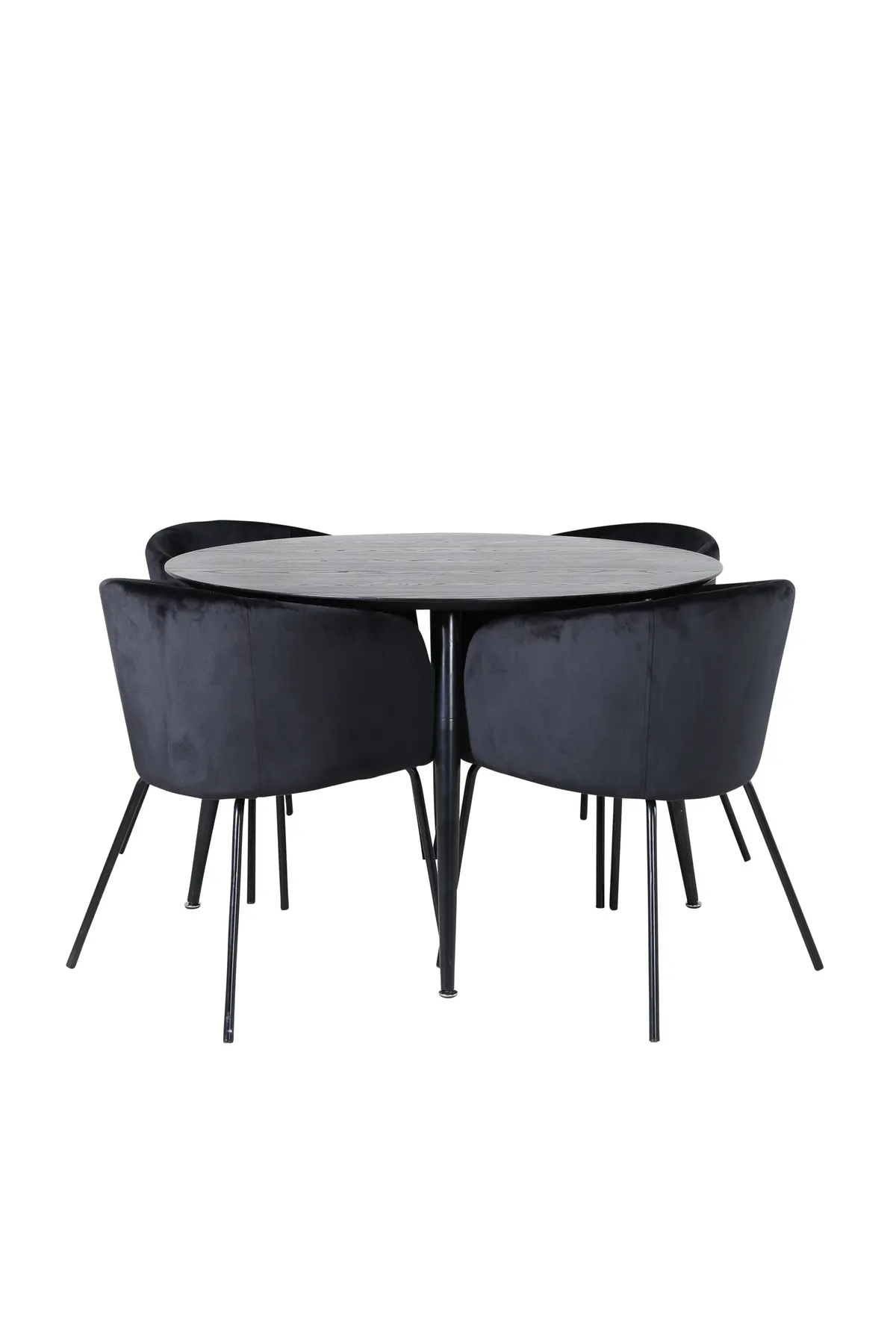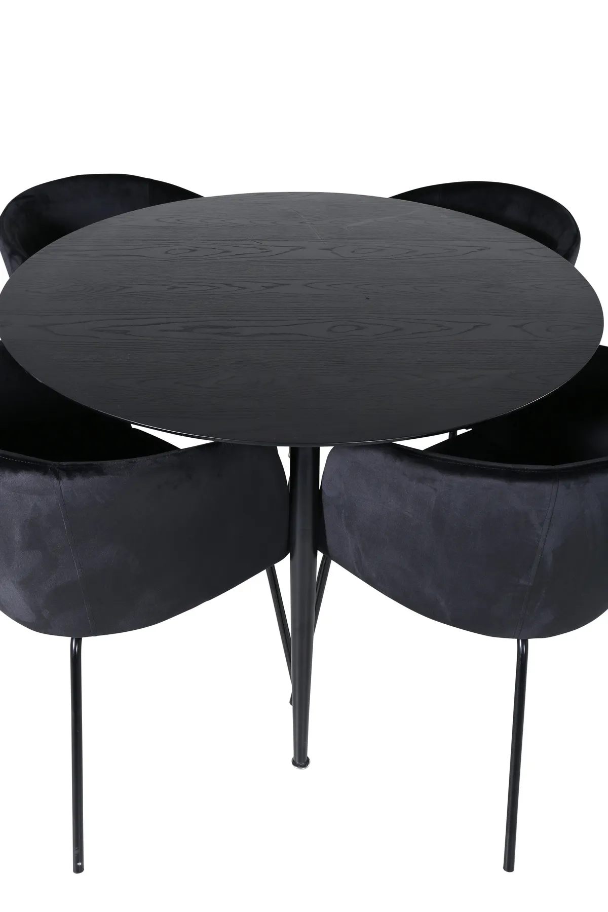 Eine allgegenwärtige schwarze Lebensmittelgruppe kommt nie aus der Zeit! Unser runder Esstisch der Serie Dip hat eine stilvolle Tischplatte aus MDF und leicht ausgestellte Tischbeine aus Metall. Der Tisch ist durchweg in schwarzer Farbe gehalten, was dem Raum ein modernes und luxuriöses Gefühl verleiht. Hier zusammen mit den Esszimmerstühlen aus der Serie Berit. Die Stuhlbeine sind aus schwarzem Eisen und der vollständig bekleidete Sitz aus weichem, schwarzem Samtstoff. Schaffen Sie einen charmanten Mittelpunkt, um den Sie und Ihre Familie sich versammeln können!