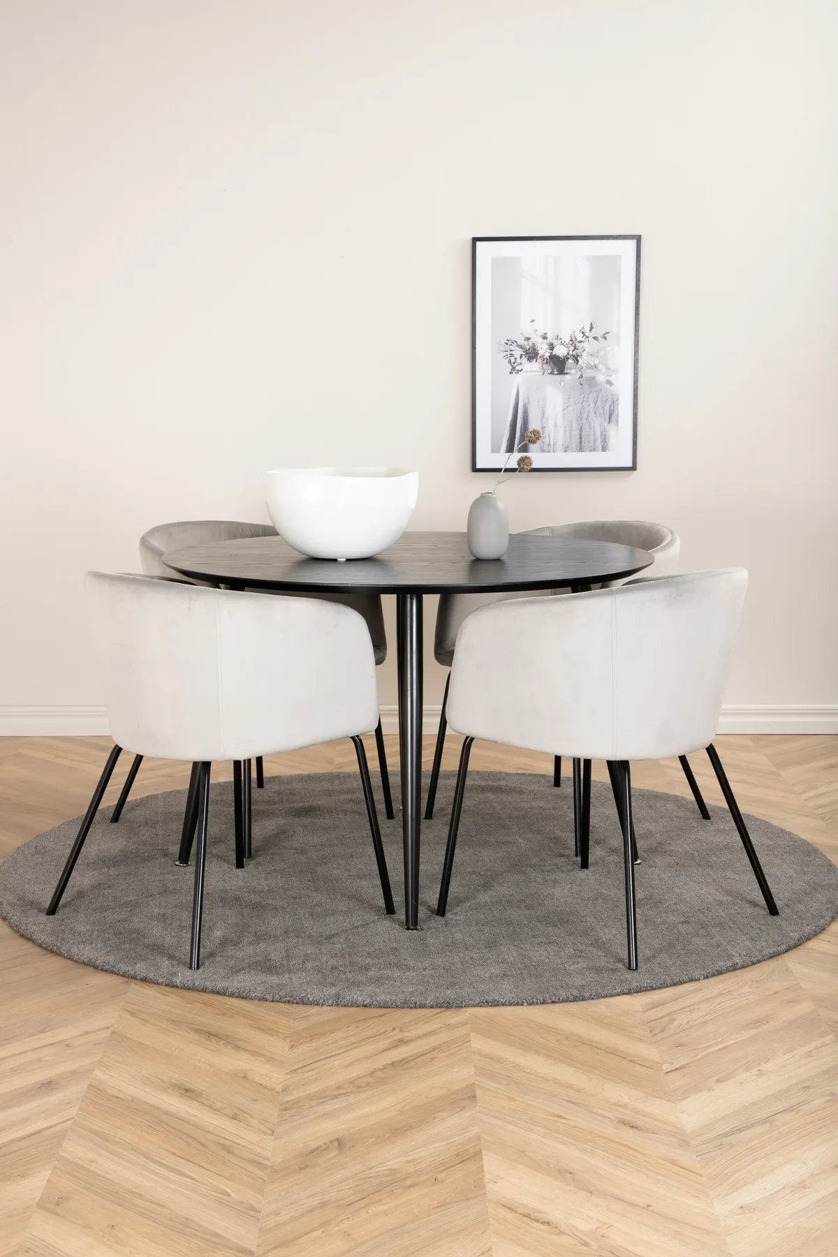 Schaffen Sie einen charmanten Mittelpunkt, um den Sie und Ihre Familie sich versammeln können! Unser runder Esstisch der Serie Dip hat eine stilvolle Tischplatte aus MDF und leicht ausgestellte Tischbeine aus Metall. Der Tisch ist durchweg in schwarzer Farbe gehalten, was dem Raum ein modernes und luxuriöses Gefühl verleiht. Hier in perfekter Kombination mit 4 Berit Esszimmerstühlen in luxuriösem Design. Die Sitzfläche ist pompös in grauem Samt und die Stuhlbeine stilvoll schmal in schwarzem Eisen. Sitzen Sie bequem und genießen Sie angenehme Mahlzeiten.
