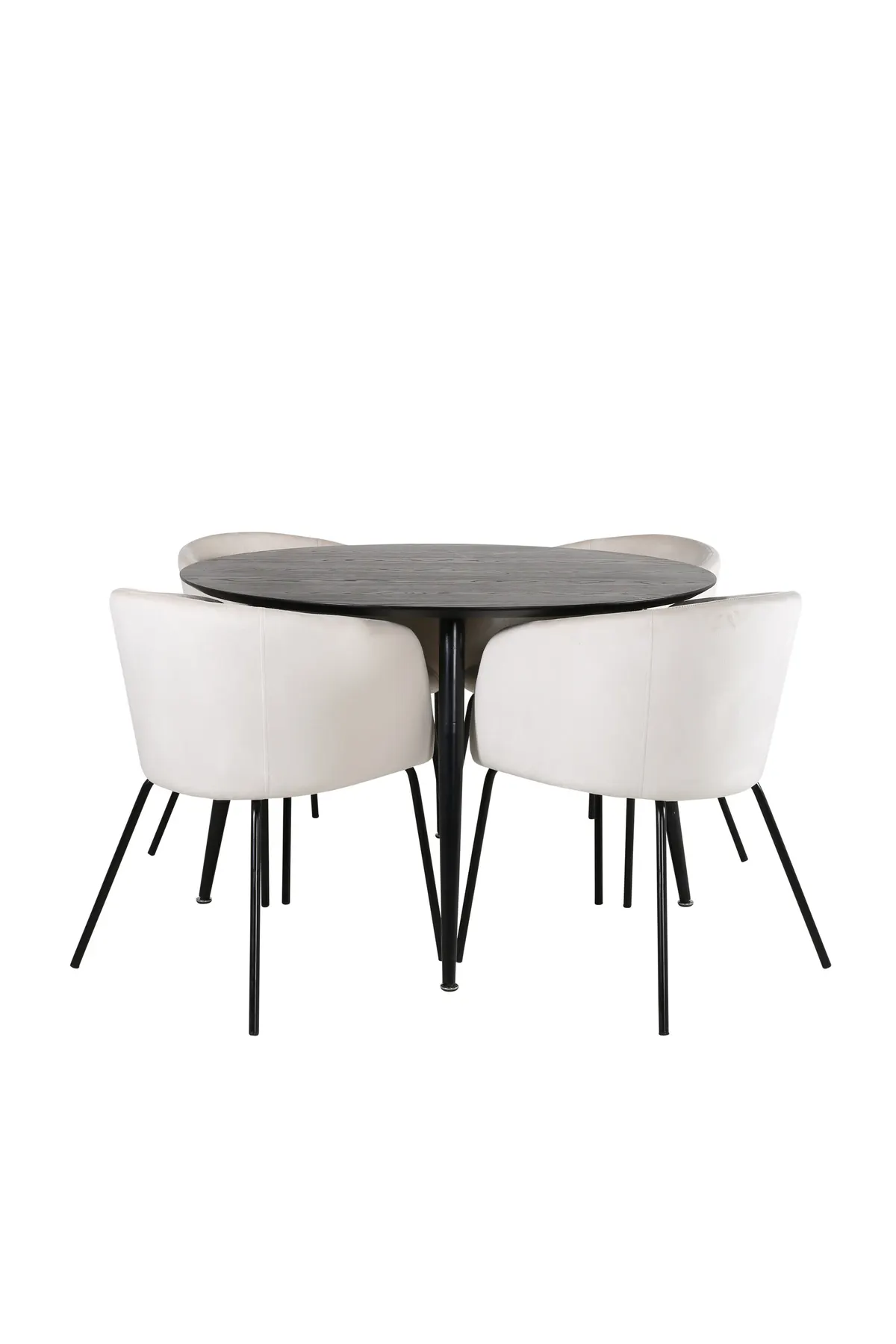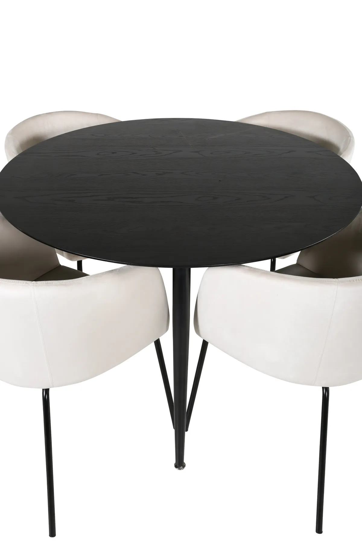 Schaffen Sie einen charmanten Mittelpunkt, um den Sie und Ihre Familie sich versammeln können! Unser runder Esstisch der Serie Dip hat eine stilvolle Tischplatte aus MDF und leicht ausgestellte Tischbeine aus Metall. Der Tisch ist durchgehend in schwarzer Farbe gehalten, was dem Raum ein modernes und luxuriöses Gefühl verleiht. Hier zusammen mit den Esszimmerstühlen aus der Serie Berit. Die Stuhlbeine sind aus schwarzem Eisen und die voll bekleidete Sitzfläche aus weichem, beigem Samtstoff. Richten Sie sich einladend und angenehm ein!