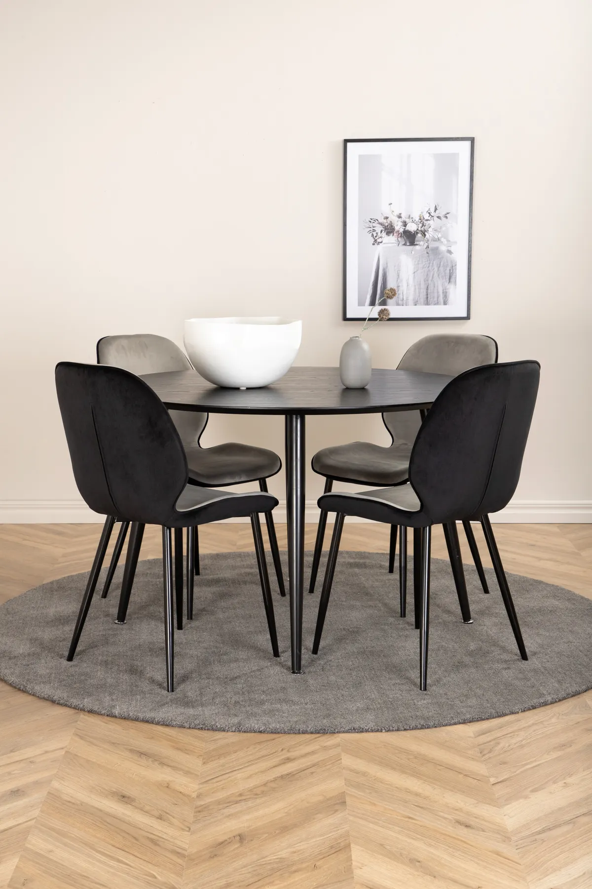Unsere beliebten Esszimmerstühle Emma Smaster Design! Die Stühle haben ein figurbetontes und stilvolles Design mit einer Sitzfläche aus hellgrauem Samt und einer Stuhllehne aus schwarzem Samt sowie Stuhlbeinen aus Eisen. Hier sind 4 Esszimmerstühle um unseren runden Esstisch dip gruppiert – ebenso stilvoll wie einladend. Der Tisch hat eine stilvolle Tischplatte aus MDF und leicht ausgestellte Tischbeine aus Metall. Lassen Sie die Zeit hier zum Highlight des Tages werden!