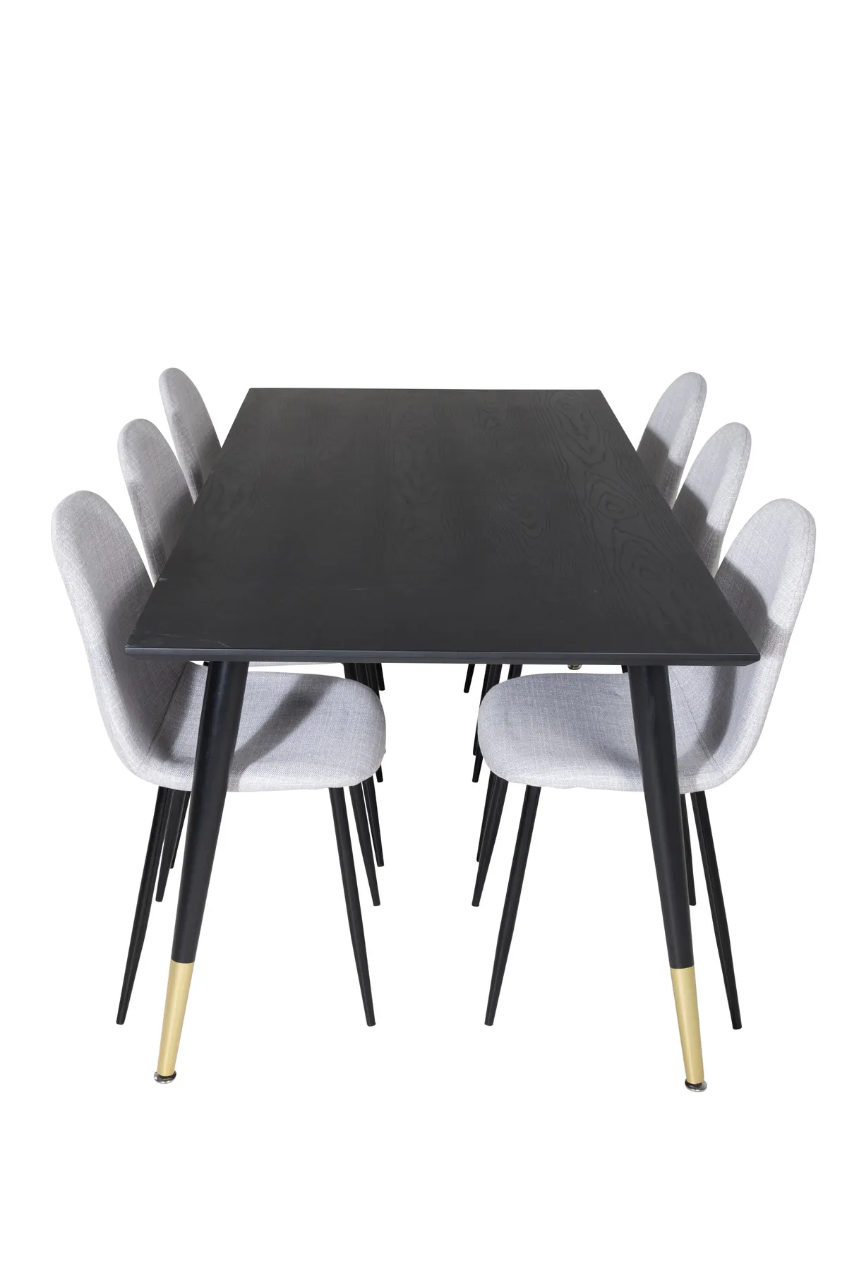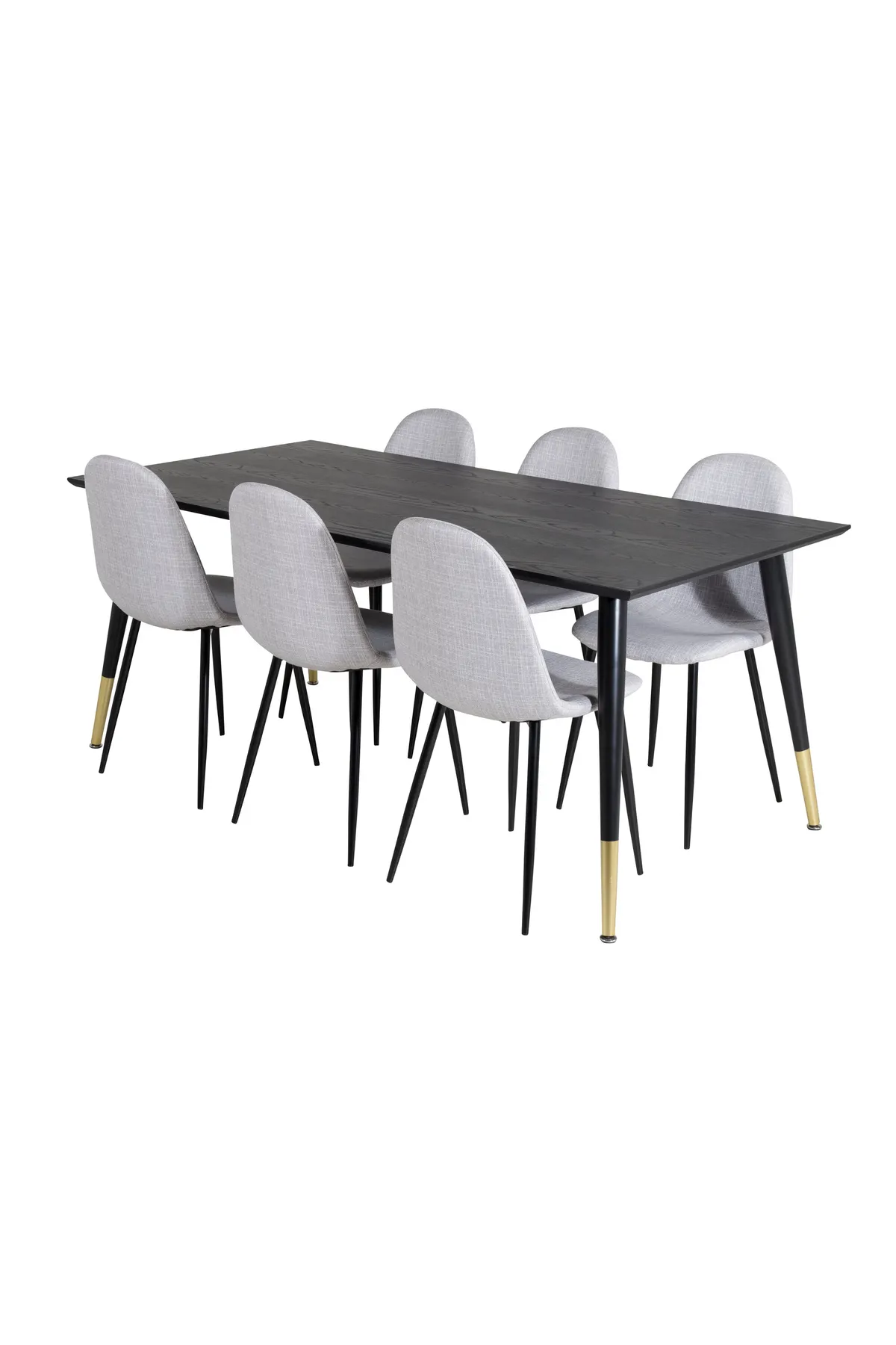Dipp Esstisch mit seinen luxuriösen goldenen Details gibt dieser Essgruppe einen eleganten und pompösen Ausdruck. Zusammen mit unseren grauen Esszimmerstühlen der Serie Polar erhalten Sie hier eine elegante und luxuriöse Essgruppe.