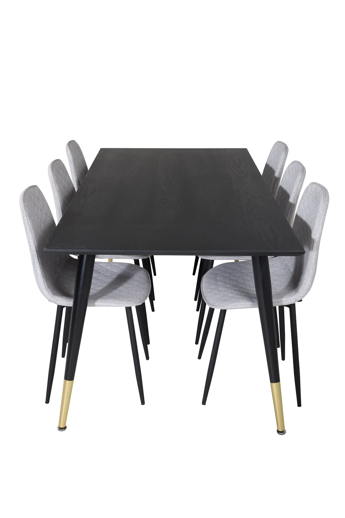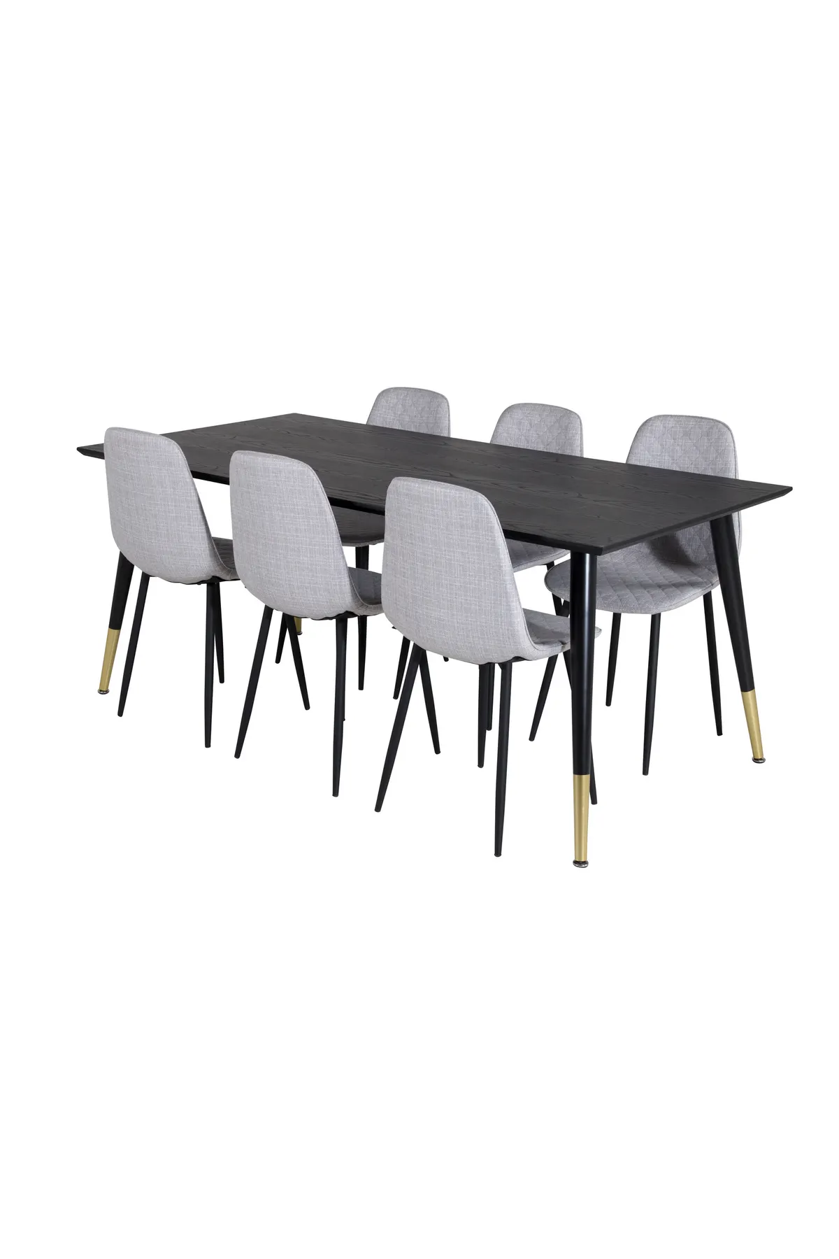 Dipp Esstisch mit seinen luxuriösen goldenen Details gibt dieser Essgruppe einen eleganten und pompösen Ausdruck. Zusammen mit unseren grauen Esszimmerstühlen der Serie Polar erhalten Sie hier eine elegante und luxuriöse Essgruppe.