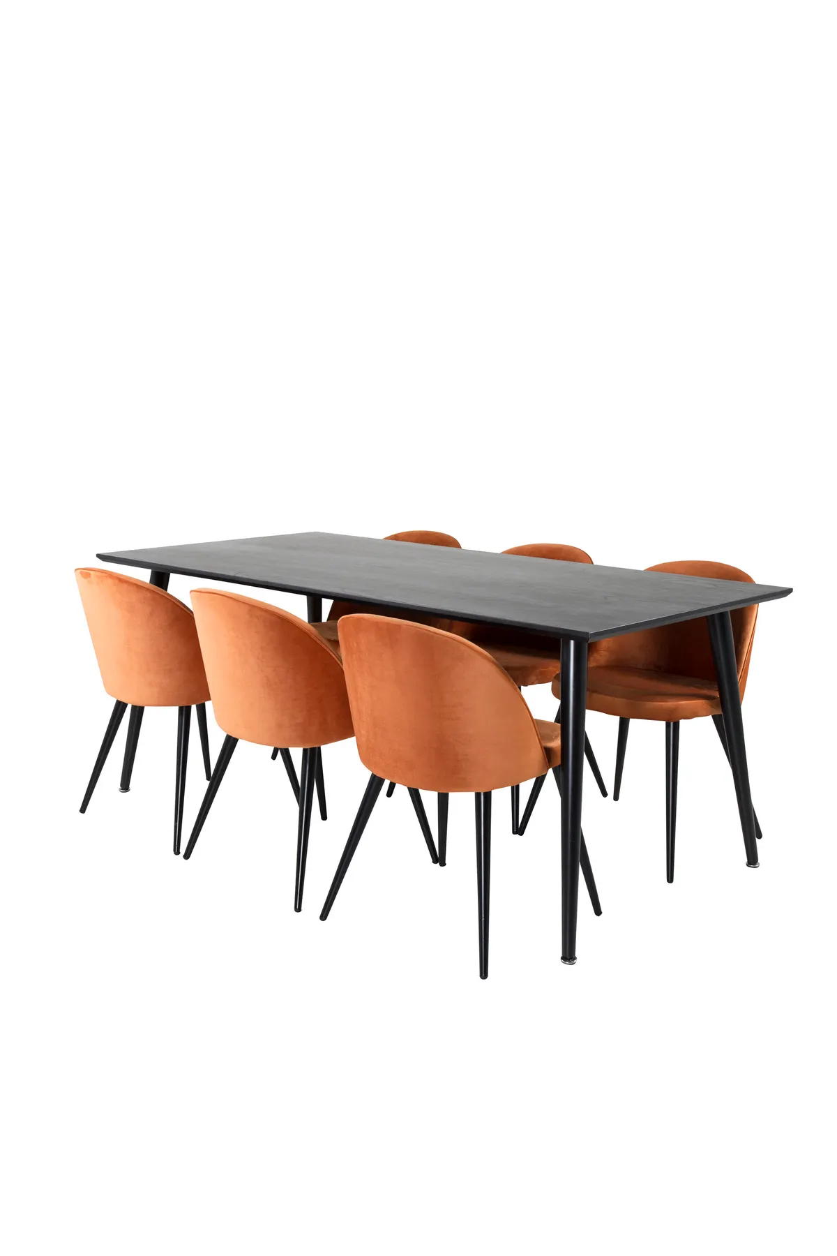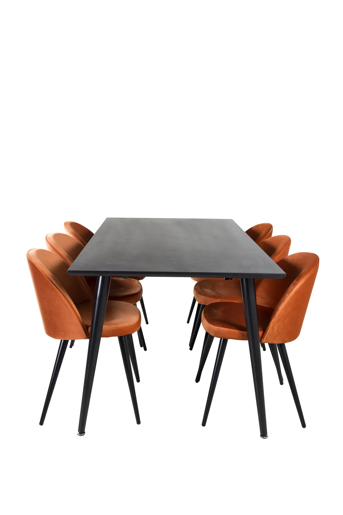 Das Kombinieren von verschiedenen Farben und verschiedenen Materialien macht alles in der Regel großen Erfolg. Mit unserem Esstisch dip und unseren orangefarbenen Esszimmerstühlen velvet erhalten Sie die Kombination – modern, gemütlich und luxuriös! Lassen Sie das Herz Ihres Zuhauses durch Ihre neue auffällige Essgruppe geprägt sein.