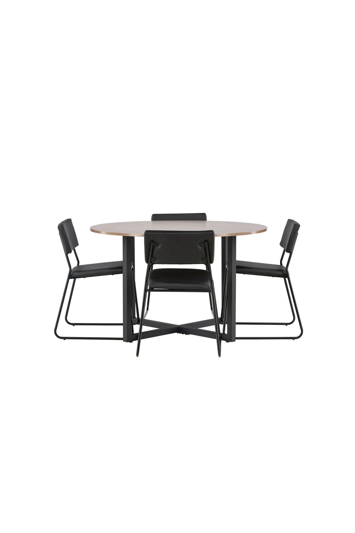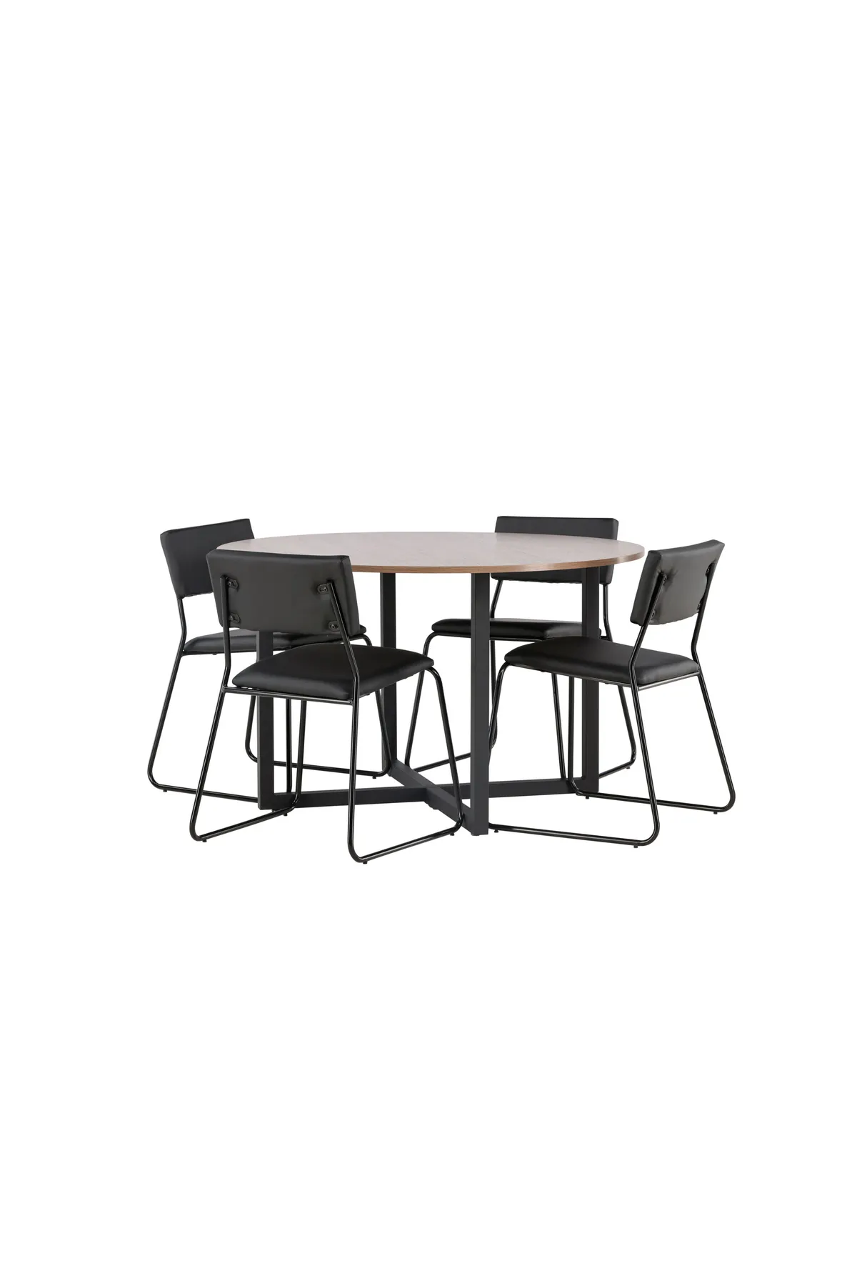Minimalistisch und modern! Unser runder Esstisch Durango hat eine nussbaumfarbene Tischplatte aus MDF und gerade Tischbeine aus schwarzem Stahl, die sich auf dem Boden zu einem Kreuz vereinen. Hier zusammen mit unseren schwarzen Esszimmerstühlen aus der Serie Kenth. Das minimalistische, moderne Design schafft ein luftiges Gefühl. Der Stuhl hat eine Rückenlehne und Sitzfläche aus schwarzem Polyurethanleder und Polyester sowie dekorative schmale Beine aus Eisen. Hier erhalten Sie eine gut durchdachte Essgruppe mit einem modebewussten Gefühl! Abmessungen des Tisches: 120cm.