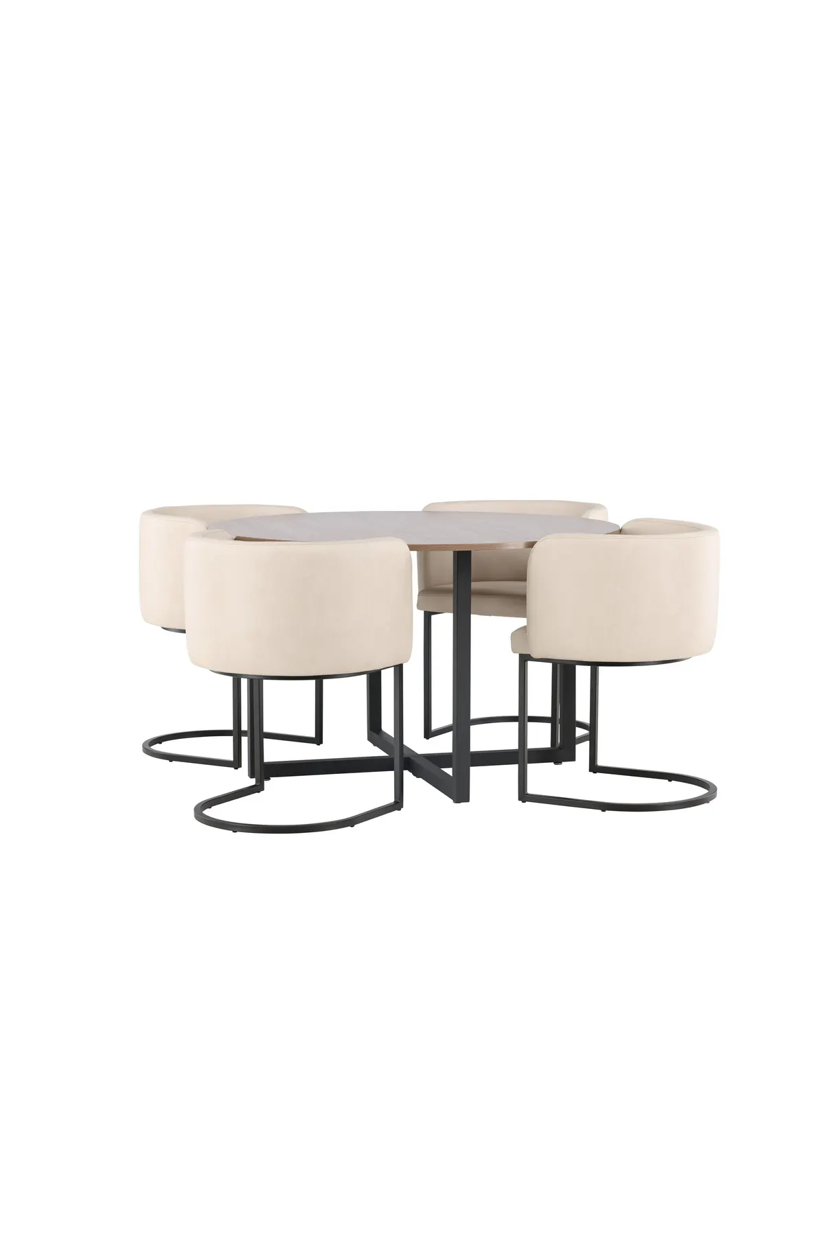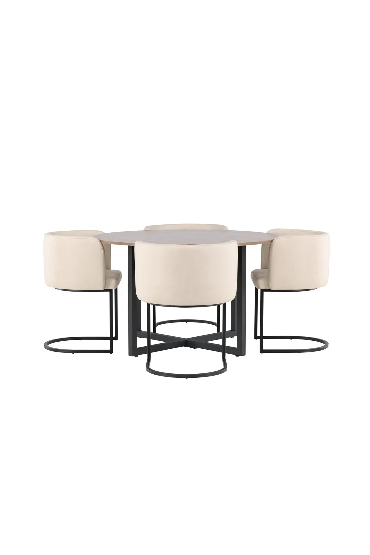 Eine Essgruppe mit einladenden Formen und stilvollem Design! Unser runder Esstisch Durango hat eine nussbaumfarbene Tischplatte aus MDF und gerade Tischbeine aus schwarzem Stahl, die sich auf dem Boden zu einem Kreuz vereinen. Hier in wunderbarer Kombination mit unseren luxuriösen Esszimmerstühlen Simrishamn. Der Stuhl hat einen vollgepolsterten Sitz mit einer abgerundeten Rückenlehne aus beigem TC-Stoff und dekorative, minimalistische Beine aus schwarzem Stahl. Schaffen Sie einen großartigen und eleganten Blickfang! Abmessungen des Tisches: 120cm.