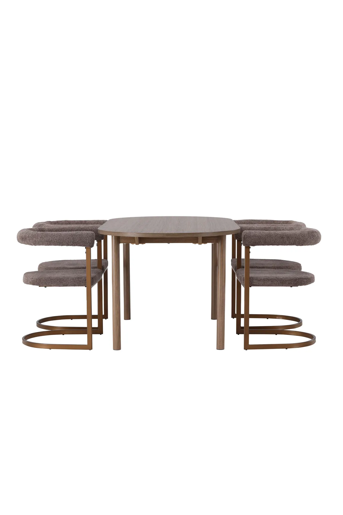 Die Stühle Morning ergänzen den Tisch durch ihr modernes Design und ihren Sitzkomfort in grauem Polyester Boucle. Die braunen Stahlgestelle der Stühle verleihen dem Raum einen erdigen Touch und bieten gleichzeitig Stabilität.