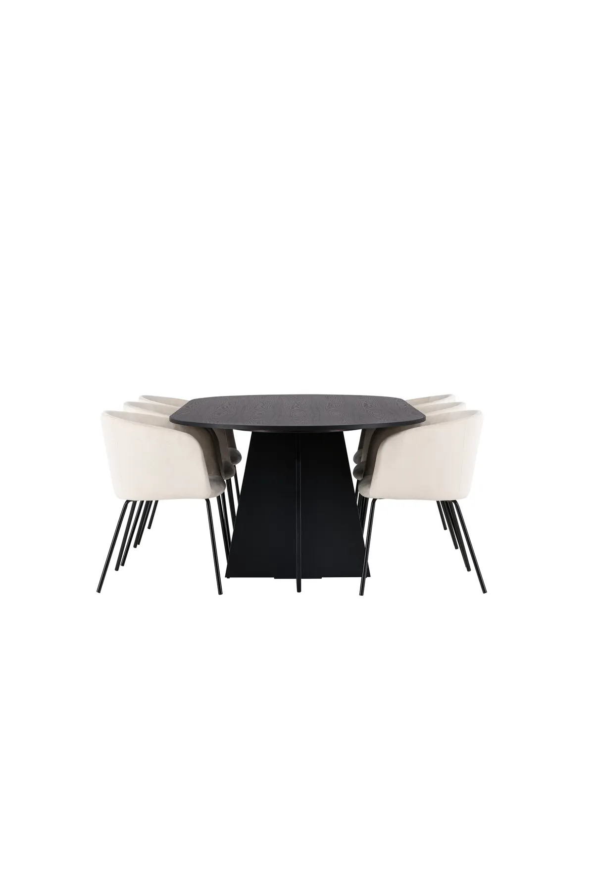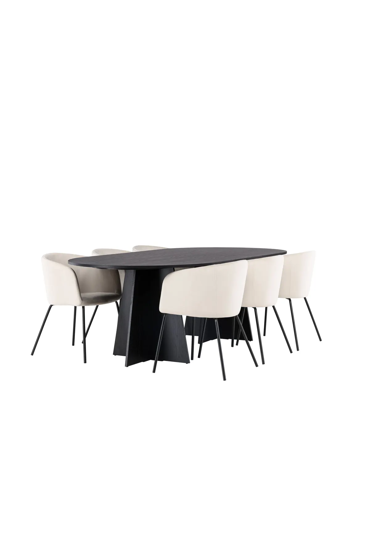 Bringen Sie Glanz in Ihr Interieur! Unser ovaler Esstisch Bootcut hat ein einzigartiges Design mit einer ovalen Tischplatte aus schwarzem MDF mit Furnier und einem markanten Rahmen mit zwei kegelförmigen Beinen in offener Ausführung. Hier zusammen mit unseren herrlichen Esszimmerstühlen Berit. Der Stuhl ist vollständig gepolstert, mit einer leicht abgerundeten Rückenlehne und Sitzfläche aus Samtstoff und schmalen Beinen aus schwarzem Eisen. Der samtene Blickfang ist hier das Tüpfelchen auf dem i! Abmessungen des Tisches: 230x115cm.