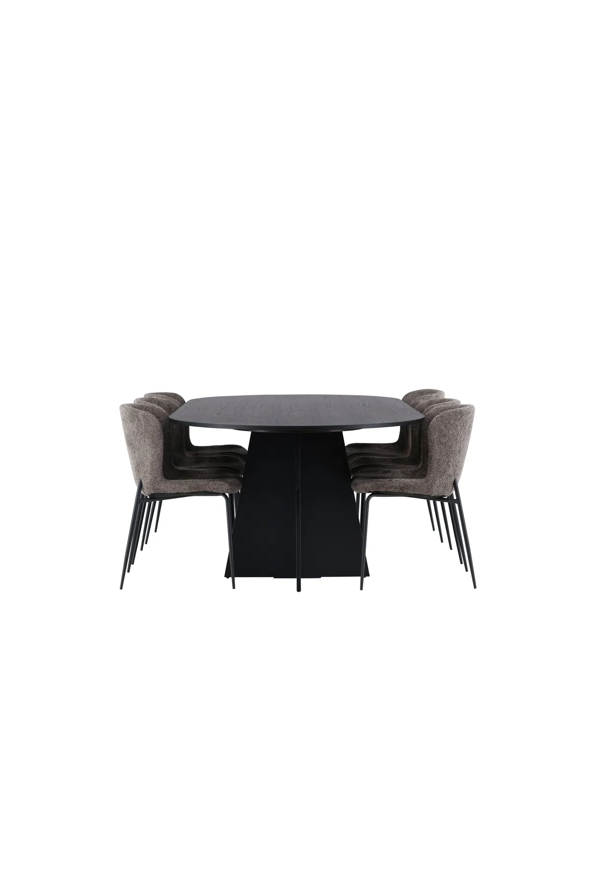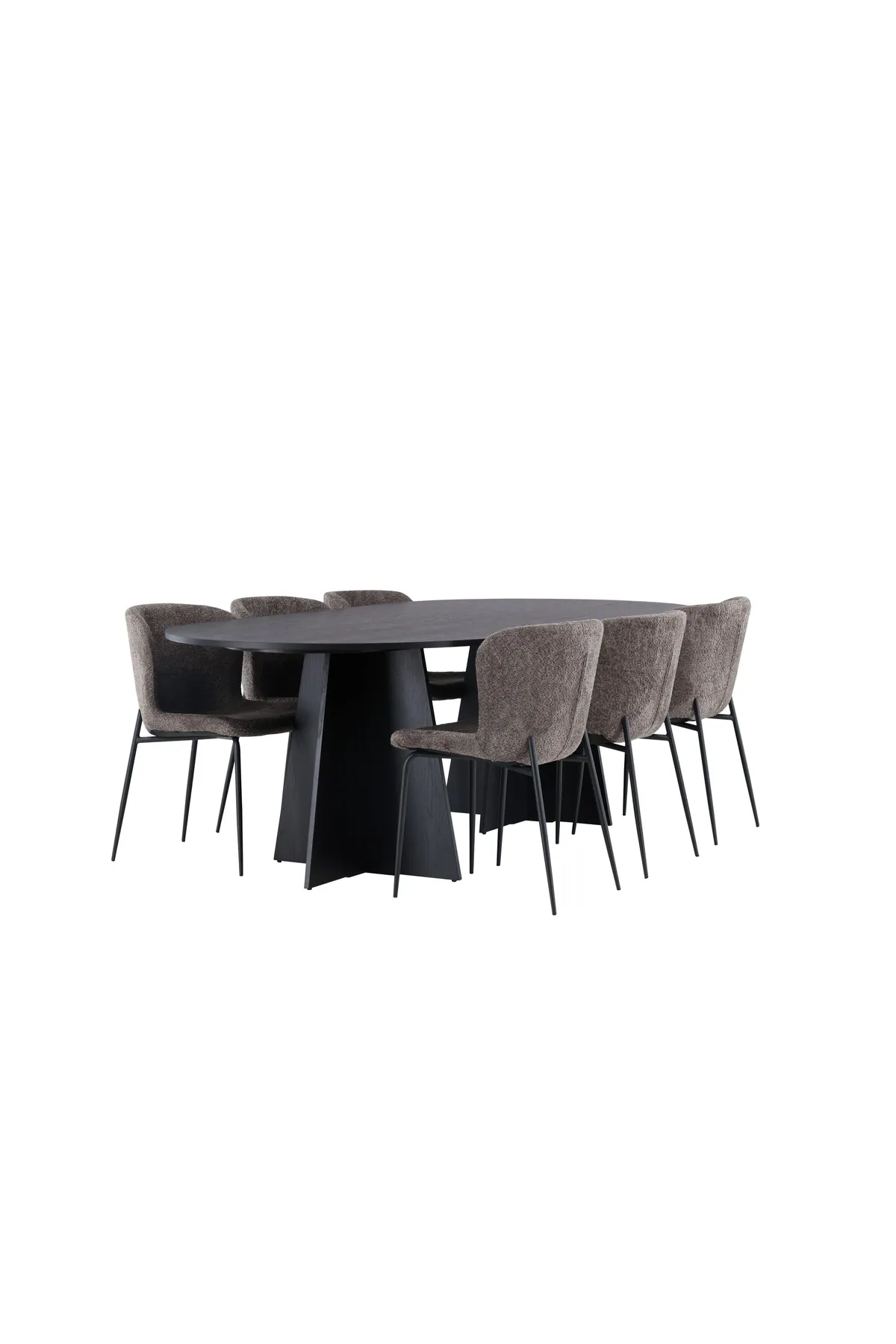 Eine durchdachte Essgruppe in trendgerechtem Design! Unser ovaler Esstisch Bootcut hat ein einzigartiges Design mit einer ovalen Tischplatte aus schwarzem MDF mit Furnier und einem markanten Rahmen mit zwei kegelförmigen Beinen in offener Ausführung. Hier zusammen mit modebewussten Esszimmerstühlen aus der Serie Modesto. Der Stuhl ist vollständig mit grauem Zottelstoff gepolstert und hat stilvolle schmale Stuhlbeine aus schwarzem Metall. Die leicht gerundete Rückenlehne und das gepolsterte Sitzkissen sorgen für zusätzlichen Komfort. Was kann man sich mehr wünschen? Abmessungen des Tisches: 230x115cm.