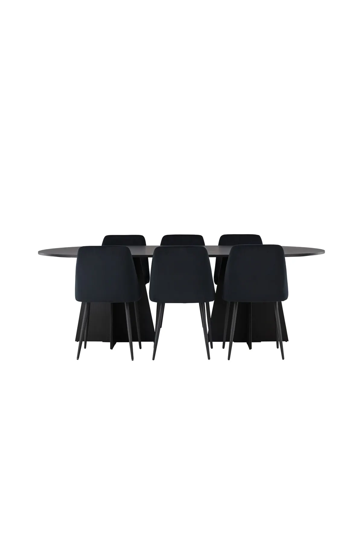 Der ovale Esstisch Bootcut ist ein Meisterwerk des modernen Designs. Mit einer ovalen Tischplatte aus schwarzem MDF mit Furnieren schafft er ein Gefühl von Exklusivität in Ihrem Zuhause. Die schlanke Tischplatte vermittelt einen minimalistischen Eindruck, der durch die robusten und einzigartig gestalteten Beine perfekt ergänzt wird. Abmessungen des Tisches: 115x230cm.