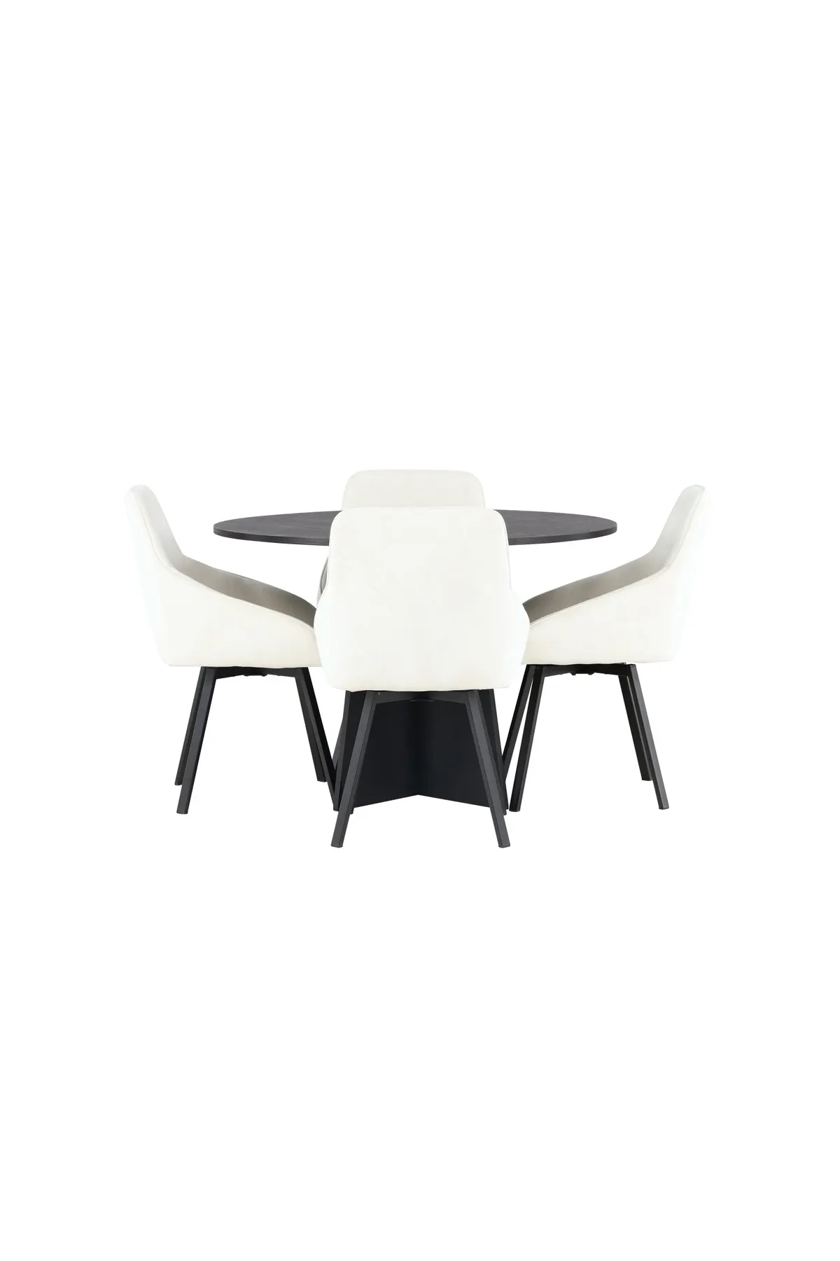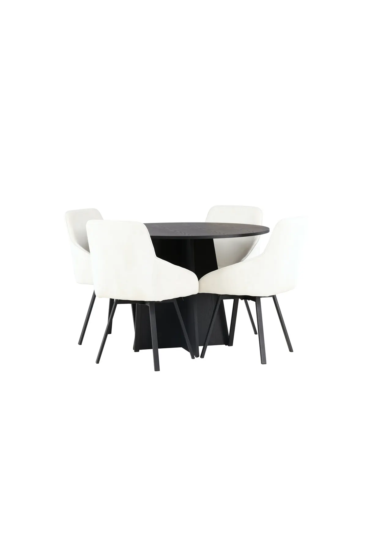 Mit dieser charmanten Farbkombination aus Beige und Schwarz verleihen die Bootcut-Essgruppe und die Rosie-Stühle Ihrem Zuhause eine moderne und einladende Atmosphäre. Schaffen Sie unvergessliche Momente mit Familie und Freunden an diesem tollen Esstisch!