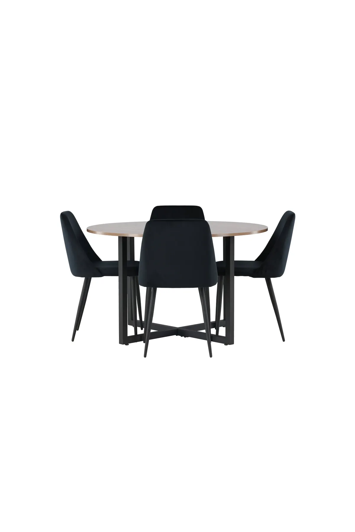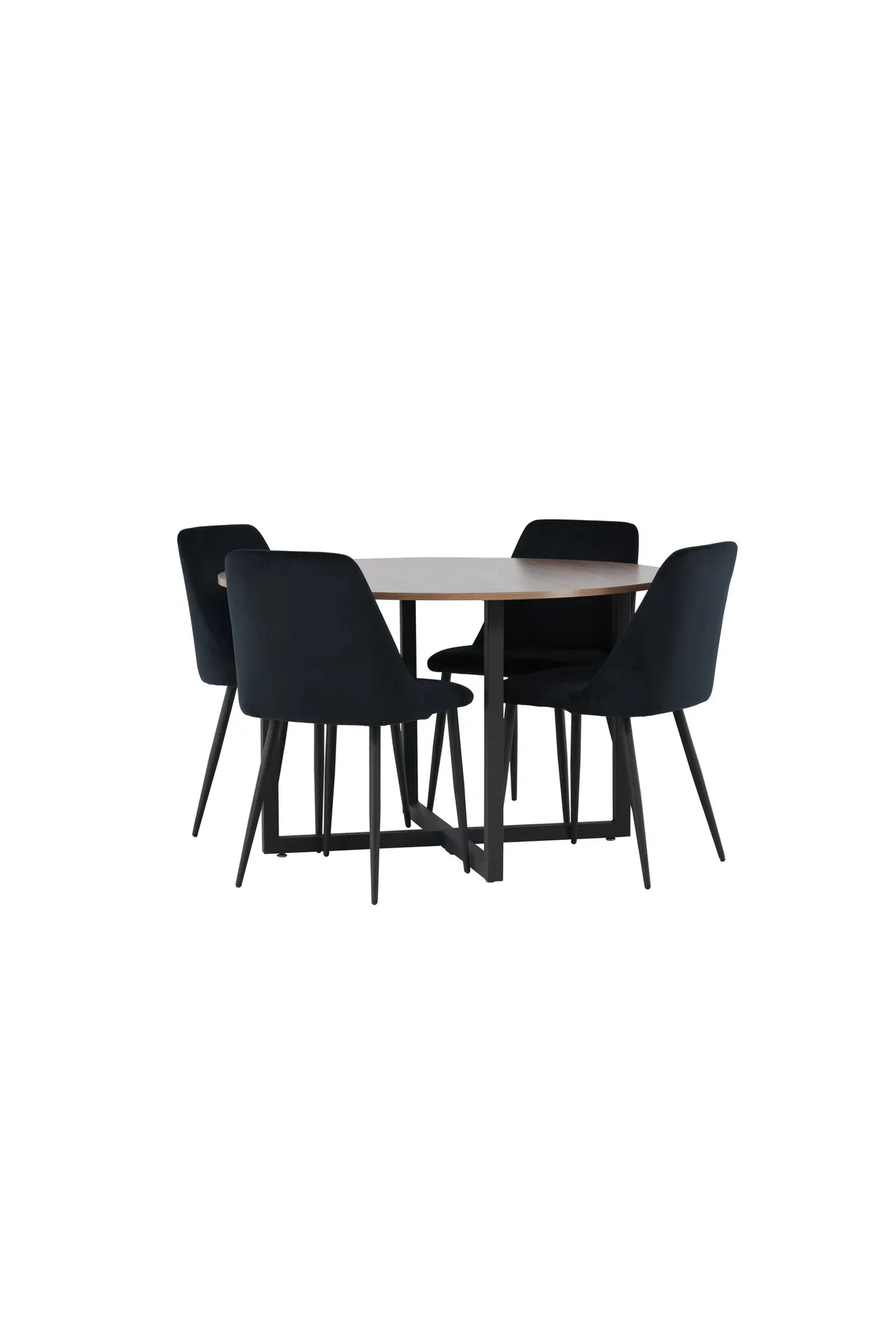 Unser runder Esstisch Durango hat eine trendige walnussfarbene MDF-Tischplatte, die nicht nur schön anzusehen, sondern auch langlebig und leicht zu reinigen ist. Die geraden Tischbeine aus schwarzem Stahl liegen in einem eleganten Kreuzmuster auf dem Boden auf und verleihen dem Tisch Stabilität und eine zusätzliche Dimension im Erscheinungsbild. Abmessungen des Tisches: 120cm.