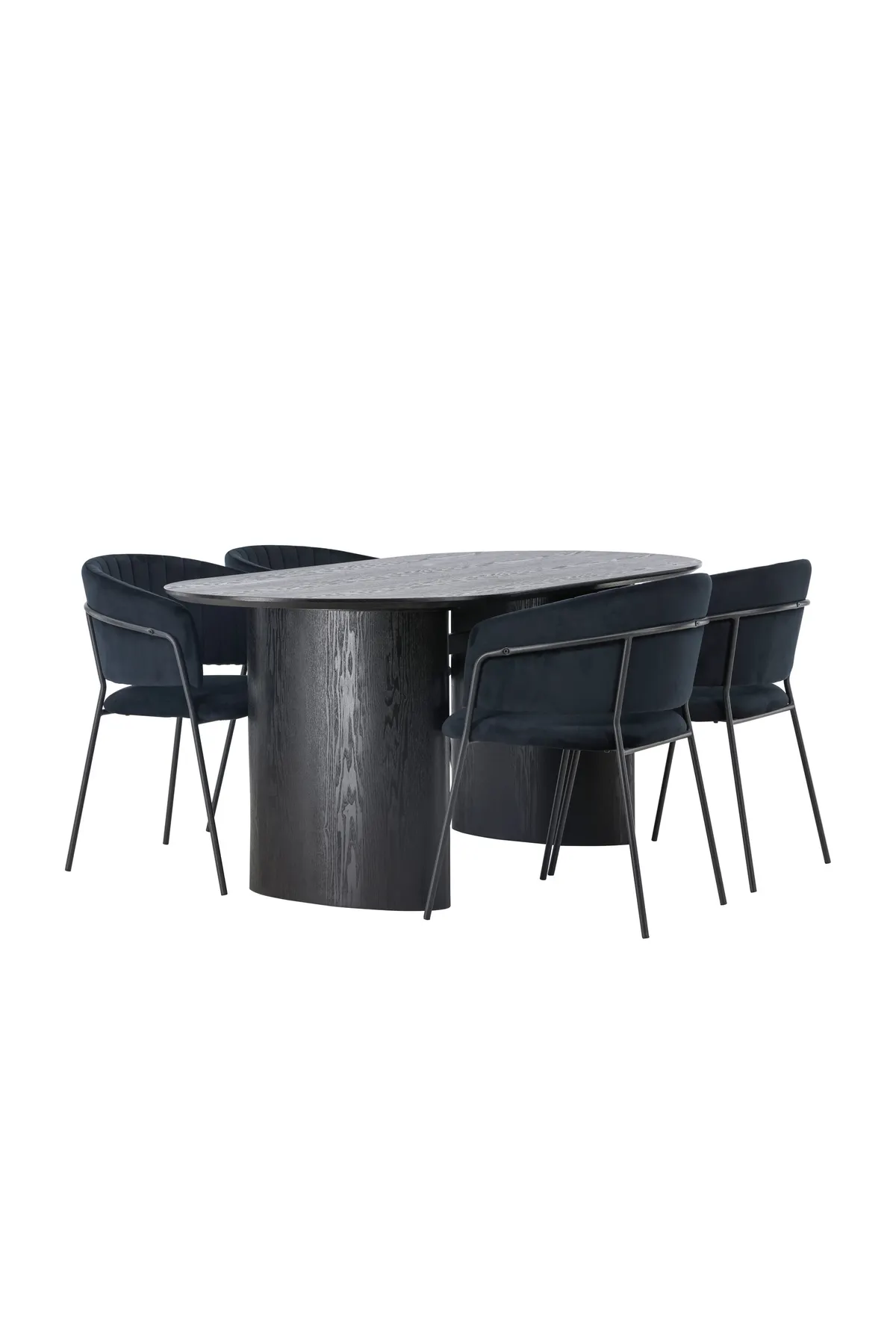 Eine unglaubliche Kombination! Der ovale Esstisch Isolde in schwarzer Farbe hat ein modernes Design mit einer ovalen Tischplatte aus MDF und einem robusten Gestell, das einen stabilen Eindruck vermittelt. Das lebendige Material gibt dem Blickfang eine schöne Bewegung. Hier in perfekter Kombination mit schwarzen Esszimmerstühlen aus der Serie Selma. Der Stuhl hat ein vollgepolstertes Design mit leicht gerundeter Rückenlehne und einem Sitz aus Samtstoff mit stilvollen Ziernähten und die Beine sind schmal in schwarzem Stahl – garantiert ebenso stilvoll wie bequem. Abmessungen des Tisches: 180x75cm.