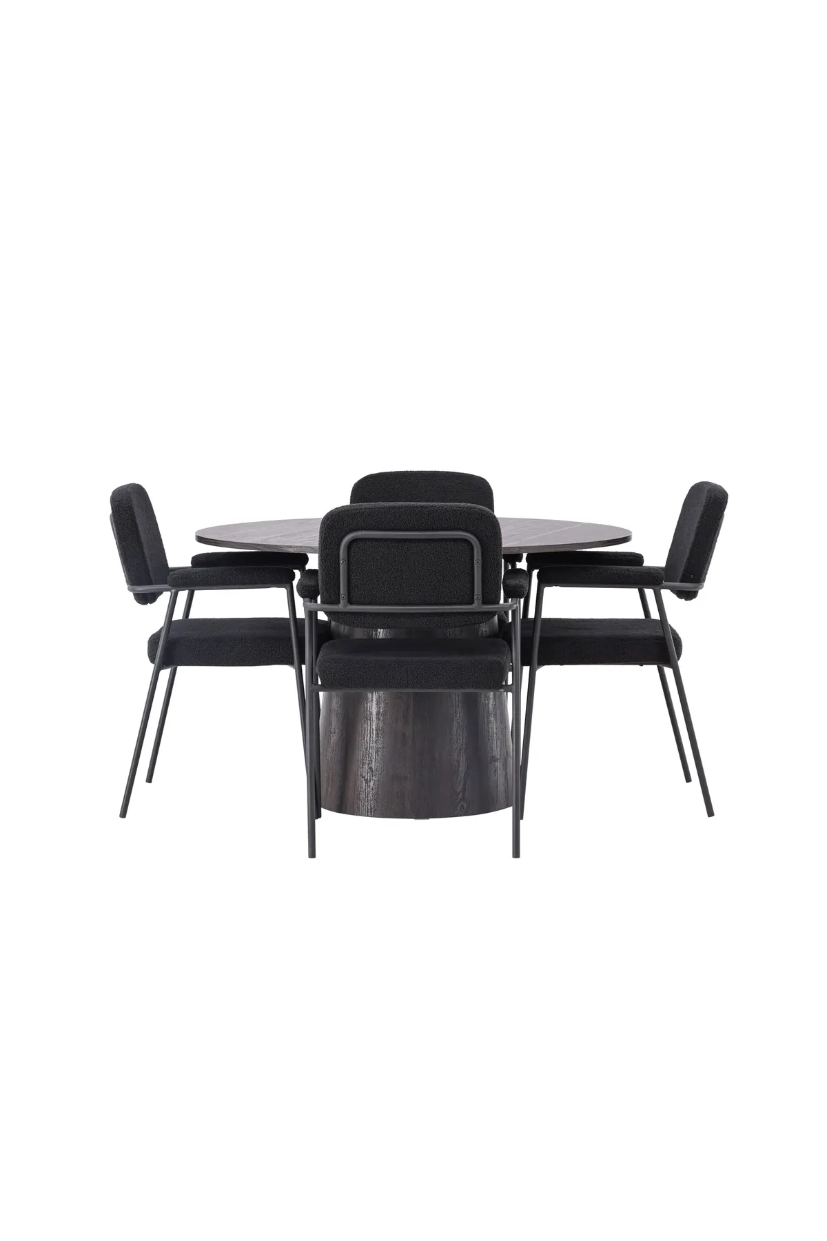Schaffen Sie einen modernen Blickfang in Ihrem Wohnzimmer! Unser wunderschöner, runder Esstisch Lanzo hat ein Gesamtdesign aus braunem MDF mit einer dünnen Platte und einem gedrehten zylindrischen Gestell, das unter der Tischmitte zentriert ist. Hier mit unseren fantastischen, schwarzen Esszimmerstühlen aus der Serie Yesterday. Der Stuhl hat einen vollständig gepolsterten Sitz aus schwarzem Bouclé-Stoff und schmale Beine mit integrierten Armlehnen aus schwarzem Metall. Der weiche Sitz ist für zusätzlichen Komfort gepolstert. Durchmesser des Tisches: 120 cm.