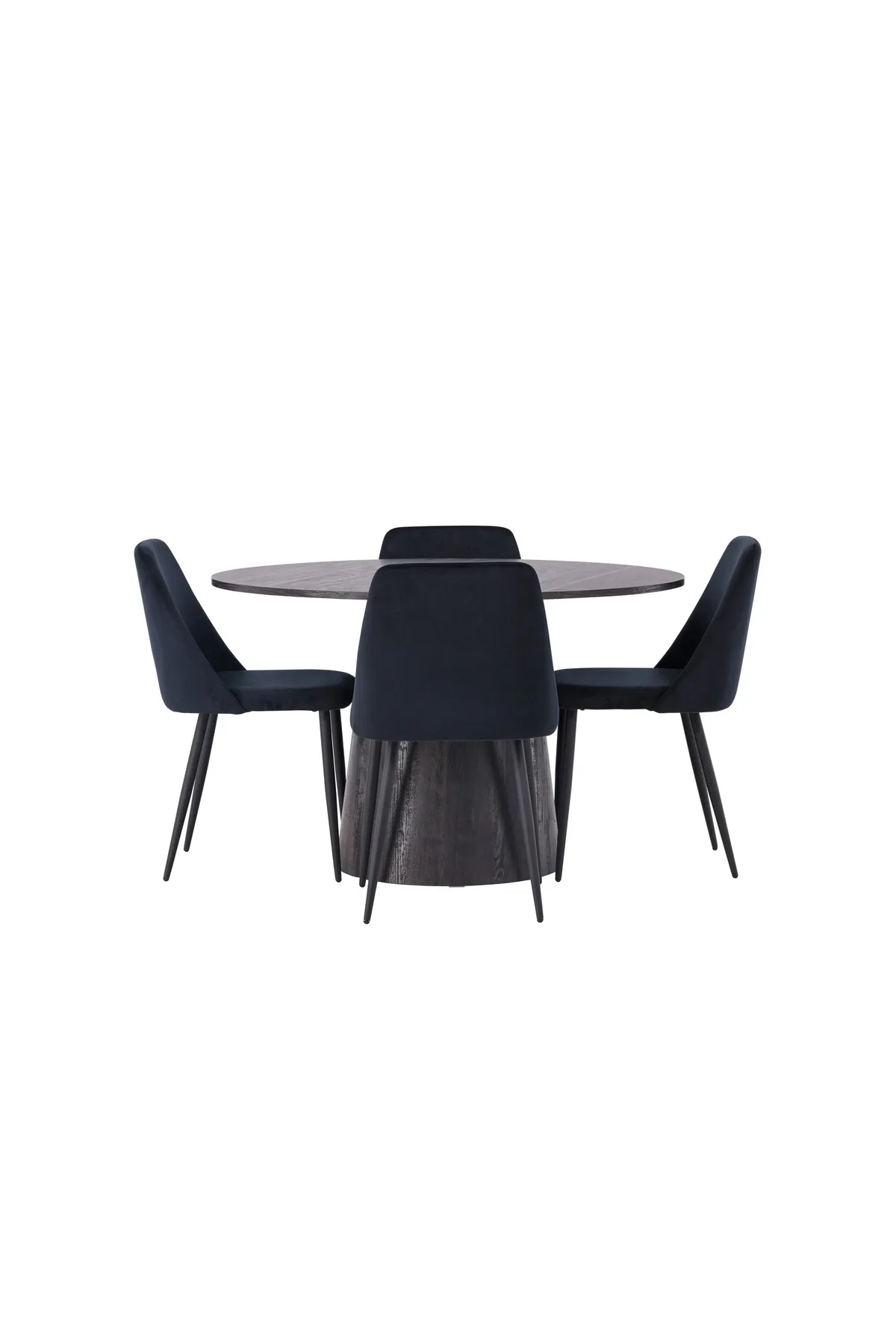 Schaffen Sie eine einladende Atmosphäre! Unser wunderschöner, runder Esstisch Lanzo hat ein Gesamtdesign aus braunem MDF mit einer dünnen Platte und einem gedrehten zylindrischen Gestell, das unter der Tischmitte zentriert ist. Hier in perfekter Kombination mit schwarzen Esszimmerstühlen aus der Serie Night. Der Stuhl hat einen voll gepolsterten Sitz aus schwarzem Samtstoff und Beine in passender schwarzer Farbe. Hier sitzen Sie so bequem wie modern! Tisch-Durchmesser: 120cm.