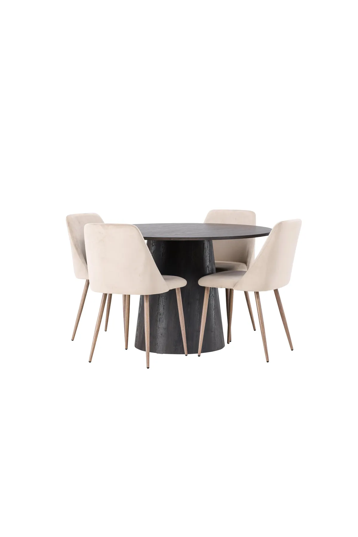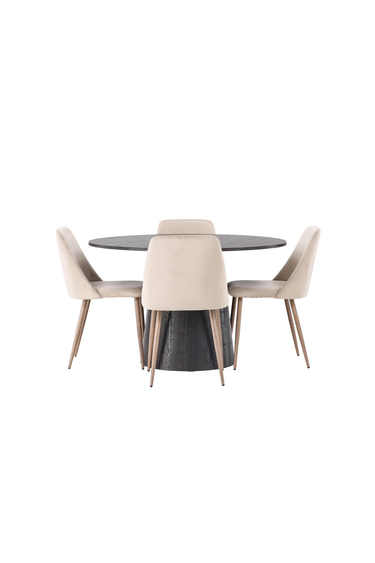 Warme Töne und charmantes Design! Unser wunderschöner, runder Esstisch Lanzo hat ein Gesamtdesign aus braunem MDF mit einer dünnen Platte und einem verdrehten zylindrischen Gestell, das unter der Mitte des Tisches zentriert ist. Hier zusammen mit unseren sandfarbenen Esszimmerstühlen aus der Serie Night. Der Stuhl hat einen vollständig gepolsterten Sitz aus braunem Samtstoff und Stuhlbeine aus nussbaumfarbenem Stahl. Ganz einfach, eine fantastische Essgruppe! Tisch-Durchmesser: 120cm.