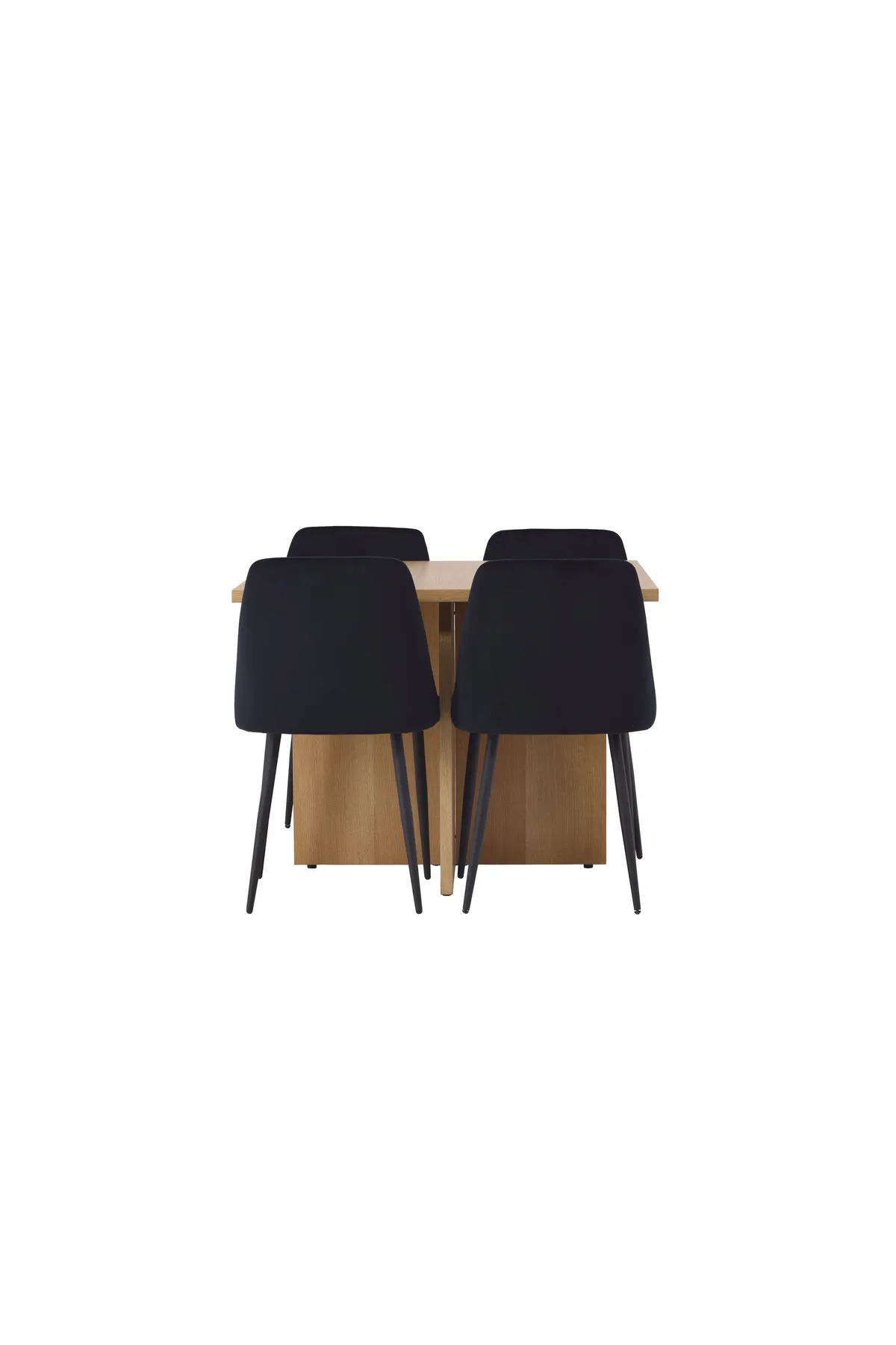 Als Ergänzung zu dem quadratischen Esstisch haben wir Stühle aus der beliebten Night-Serie ausgewählt. Diese Stühle haben einen exklusiven Touch mit vollständig gepolsterten Sitzen aus schwarzem Samtstoff und passenden schwarzen Stuhlbeinen. Mit ihrer samtigen Polsterung bringen die Stühle einen luxuriösen Schimmer in den Raum und tragen zu einer modebewussten Atmosphäre bei.