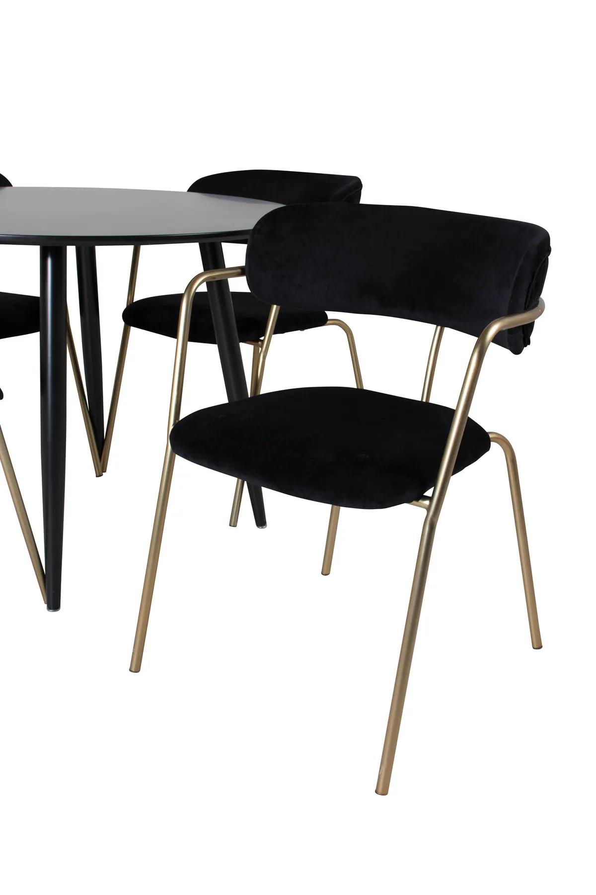 Eine trendtaugliche Essgruppe mit schwarzer Eleganz und modernen Golddetails. Unser beliebter runder Esstisch Plaza in festlicher Kombination mit unseren Samtstühlen der Serie Arrow. Mit seinem stilvollen Design passt diese Essgruppe in die meisten Haushalte und ist dennoch alltagstauglich für eine Party.