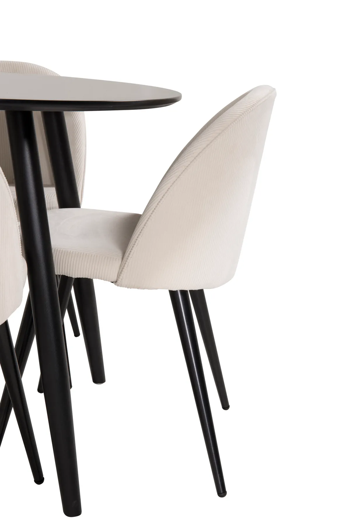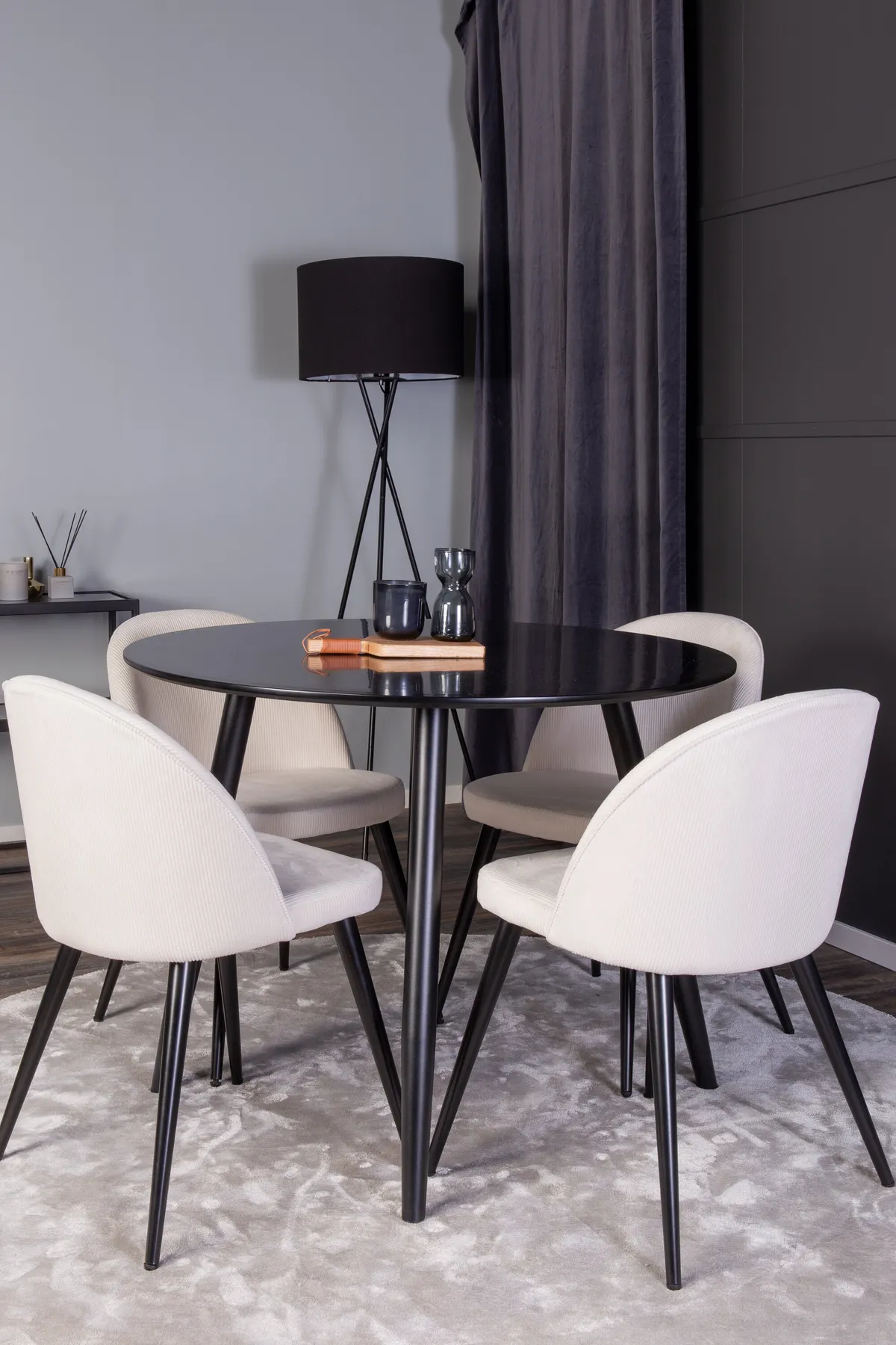 Eine Essgruppe in modernem und stilvollem Design. Esstisch Plaza und Esszimmerstühle Velvet sind die perfekte Kombination für das Herzstück Ihres Zuhauses, das wahrscheinlich genauso gut zu Ihren Bedürfnissen passt wie zu Ihrer übrigen Einrichtung.
