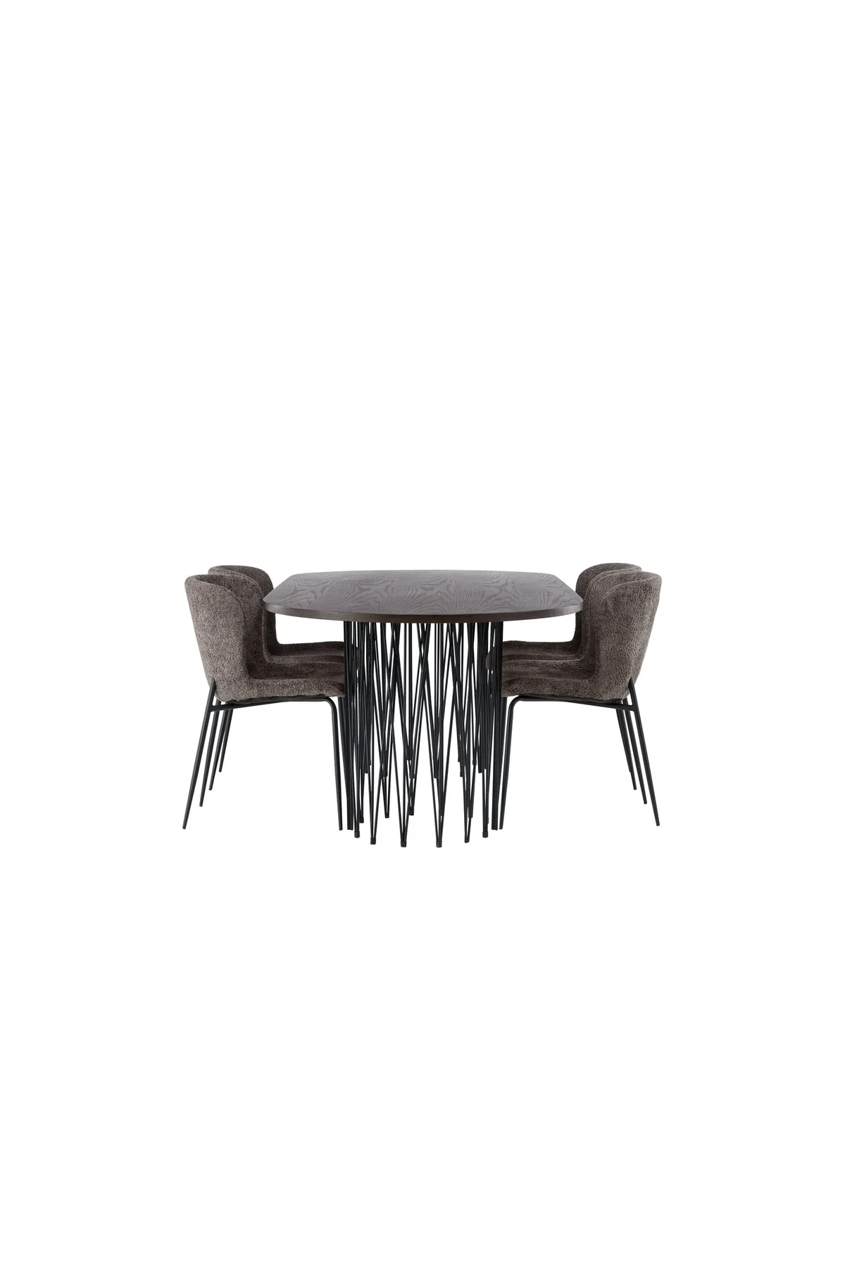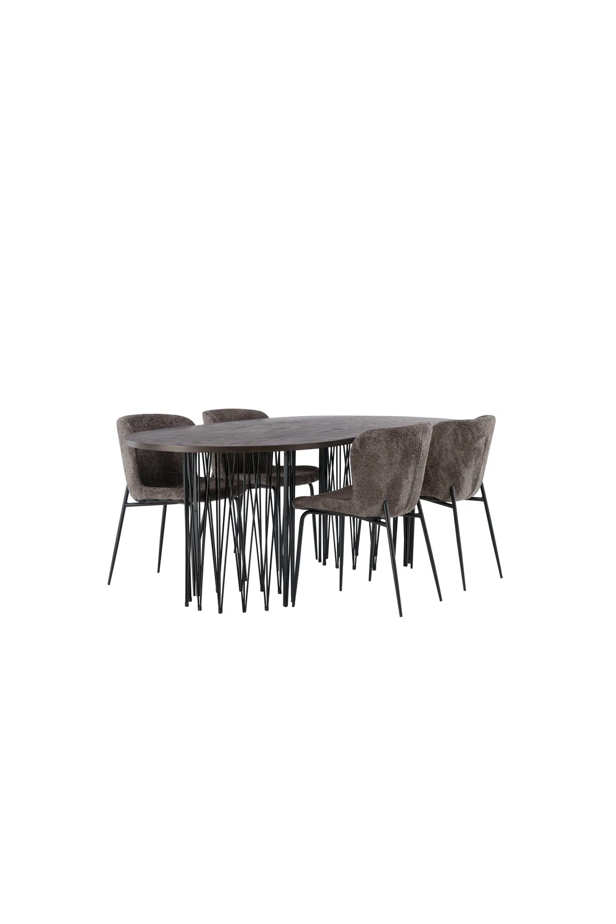 Diese Essgruppe strahlt Luxus aus! Unser ovaler Esstisch Stone besticht durch sein modebewusstes Design. Der Tisch hat eine schöne braunfarbene Tischplatte aus MDF mit Furnier und zwei dekorative zylindrische Gestelle aus schwarzem Metall. Hier zusammen mit modebewussten Esszimmerstühlen aus der Serie Modesto. Der Stuhl ist vollständig mit beigem Zottelstoff gepolstert und hat stilvolle schmale Stuhlbeine aus schwarzem Metall. Die leicht gerundete Rückenlehne und das gepolsterte Sitzkissen sorgen für zusätzlichen Komfort und verlängern angenehme Mahlzeiten rund um den Esstisch. Ein charmantes Herzstück mit den richtigen Eigenschaften! Abmessungen des Tisches: 220x100cm.