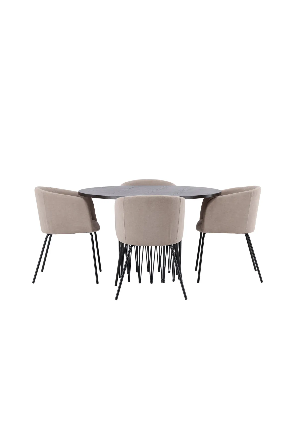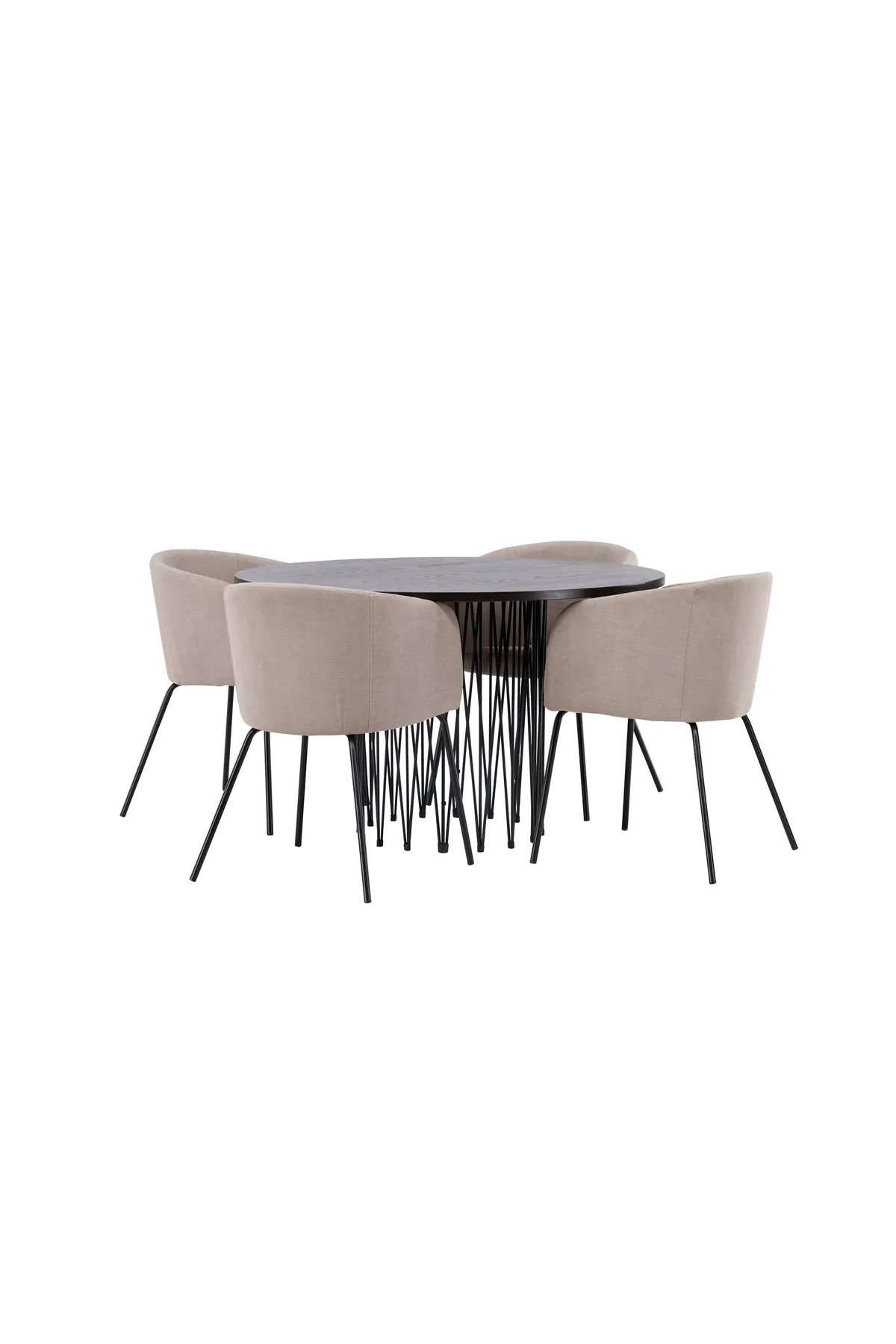 Moderne Formen und luxuriöse Verarbeitung! Der runde Esstisch Stone besticht durch ein modebewusstes Design mit einer schönen braunen MDF-Tischplatte mit Furnier und einem dekorativen zylindrischen Fuß aus schwarzem Metall. Hier zusammen mit unseren bequemen Esszimmerstühlen Berit. Der Stuhl hat ein vollgepolstertes Design mit einer leicht abgerundeten Rückenlehne und Sitzfläche aus Polyster-Leinen und schmalen Beinen aus schwarzem Eisen. Ganz einfach, eine wunderbare Kombination! Abmessungen des Tisches: 120cm.