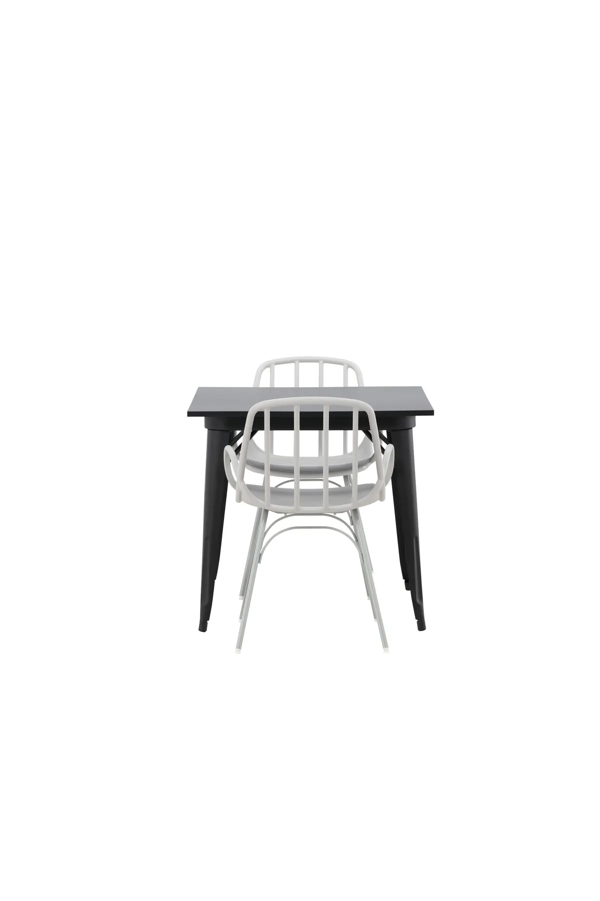 Richten Sie sich elegant und einladend mit einer trendigen Essgruppe ein! Der Esstisch Tempe hat ein skandinavisches Design mit geraden, nordischen Formen, die den Test der Zeit bestehen. Hergestellt mit einer quadratischen Tischplatte aus schwarzem MDF und Tischbeinen aus schwarzem Metall. Hier zusammen mit 2 Esszimmerstühlen aus der Serie Dyrön. Der Stuhl ist ebenso stilvoll wie praktisch und besteht aus beigem Kunststoff und Stahl. Der Stuhl hat integrierte Armlehnen und ein geripptes Design in der leicht abgerundeten Rückenlehne. Eine perfekte Essgruppe für die kleinere Küche!