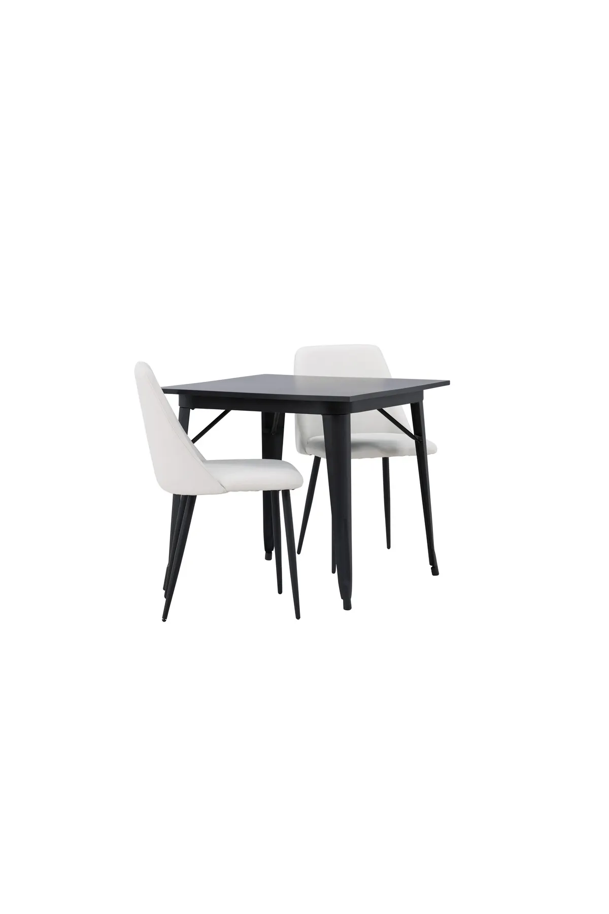 Eine charmante Essgruppe für zwei! Unser quadratischer Esstisch Tempe hat eine ordentliche Größe und ein trendiges, skandinavisches Design. Hergestellt mit einer Tischplatte aus schwarzem MDF und Tischbeinen aus schwarzem Metall. Hier in stilvoller Kombination mit weißen Esszimmerstühlen aus der Serie Night. Der Stuhl hat einen vollständig gepolsterten Sitz aus weißem PU, der sich ebenso luxuriös wie elegant anfühlt, und die Beine sind aus schwarzem Stahl. Die Sitzfläche ist ebenfalls gepolstert für zusätzlichen Komfort. Hier erhalten Sie die perfekte Kombination! Abmessungen des Tisches: 80x80cm.