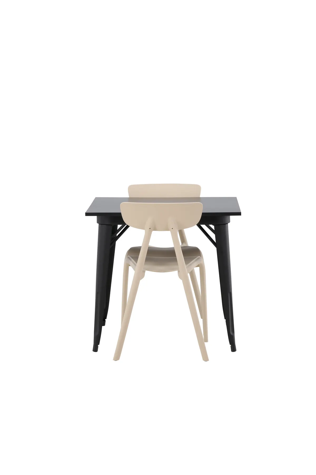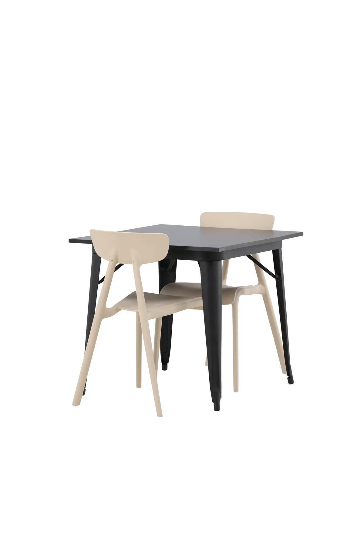Richten Sie Ihr Wohnzimmer elegant und einladend mit einer trendigen Essgruppe ein! Der Esstisch Tempe hat ein skandinavisches Design mit geraden nordischen Formen, die der Zeit trotzen. Er besteht aus einer quadratischen Tischplatte aus schwarzem MDF und Beinen aus schwarzem Metall. Hier zusammen mit 2 Esszimmerstühlen aus der Serie Ursholmen. Aus strapazierfähigem Kunststoff in einem sanften Beigeton, der sich gut mit anderen Möbeln kombinieren lässt. Der Stuhl hat eine hübsche Rückenlehne mit einer etwas tieferen Sitzfläche und leicht ausgestellten Beinen im skandinavischen Design. Eine perfekte Essgruppe für die kleinere Küche!