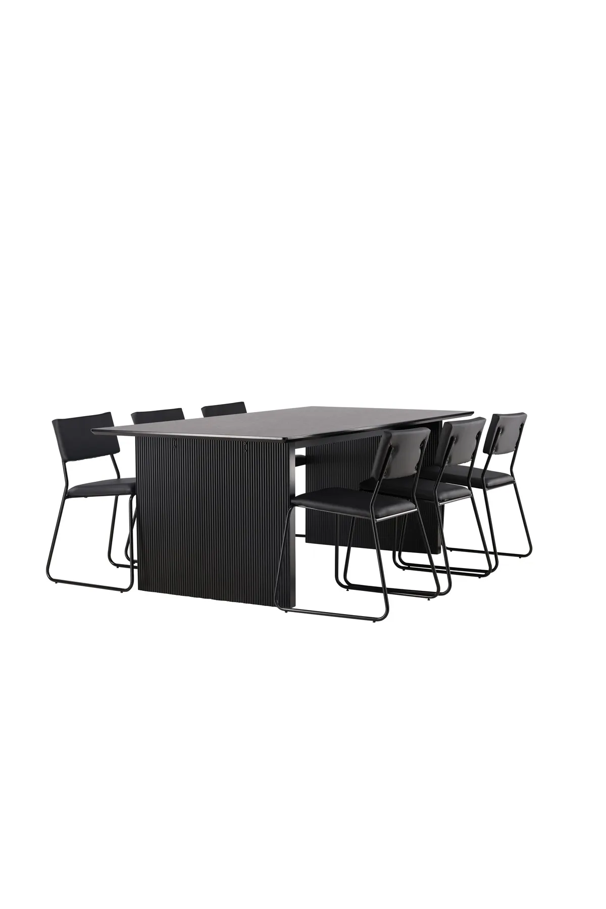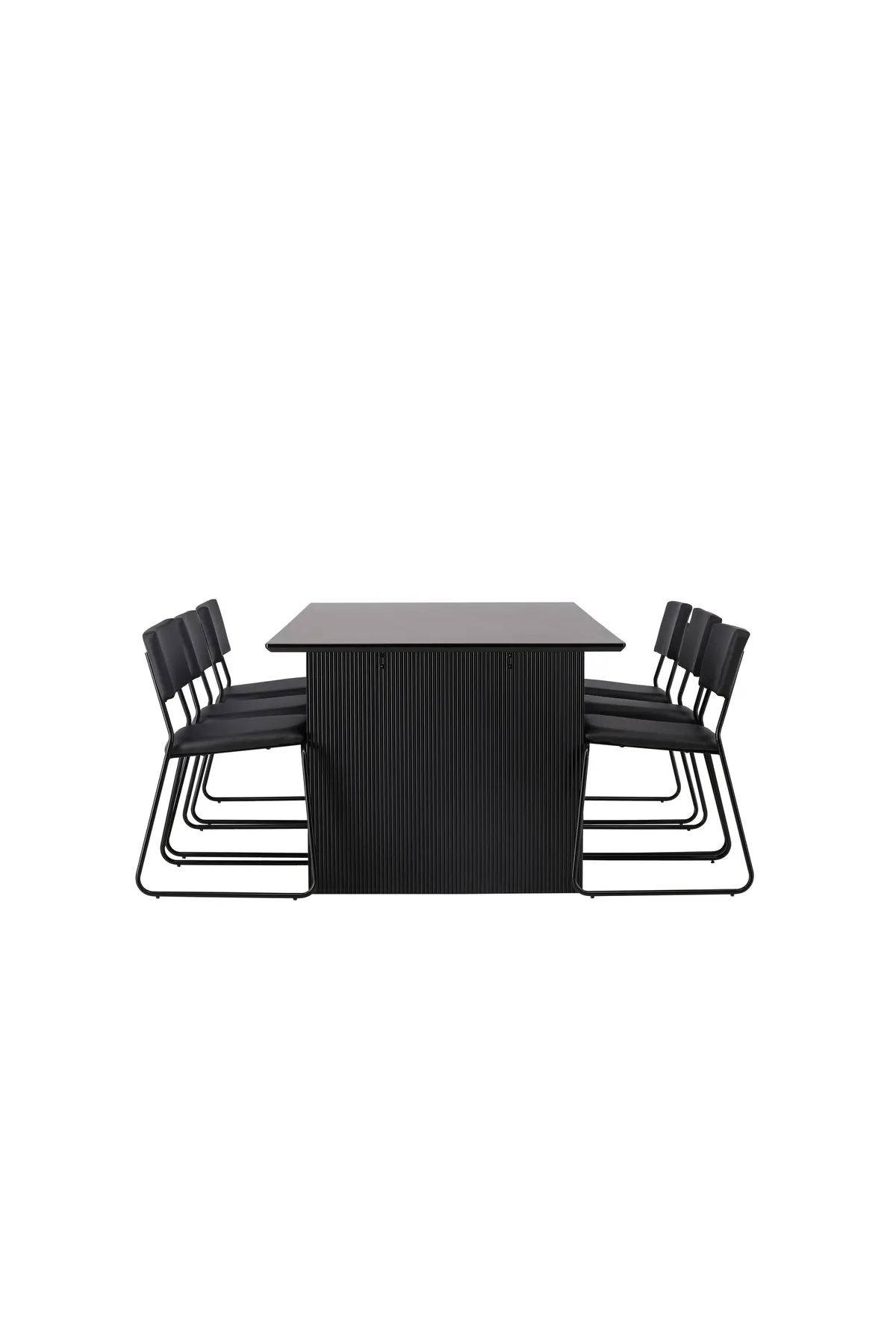 Eine schwarze Essgruppe mit minimalistischen Elementen! Der rechteckige Esstisch Vail hat geradlinige nordische Formen und ist aus robustem MDF in rußschwarzer Farbe gefertigt. Die Tischplatte ist dünn in einem rechteckigen Design und balanciert auf zwei stabilen Holzplatten, die den Sockel bilden. Hier zusammen mit unseren schwarzen Esszimmerstühlen aus der Serie Kenth. Das minimalistische, moderne Design schafft ein luftiges Gefühl. Der Stuhl hat eine Rückenlehne und Sitzfläche aus schwarzem Polyurethanleder und Polyester sowie dekorative schmale Beine aus Eisen. Schaffen Sie eine festliche Atmosphäre! Abmessungen des Tisches: 200x100cm.