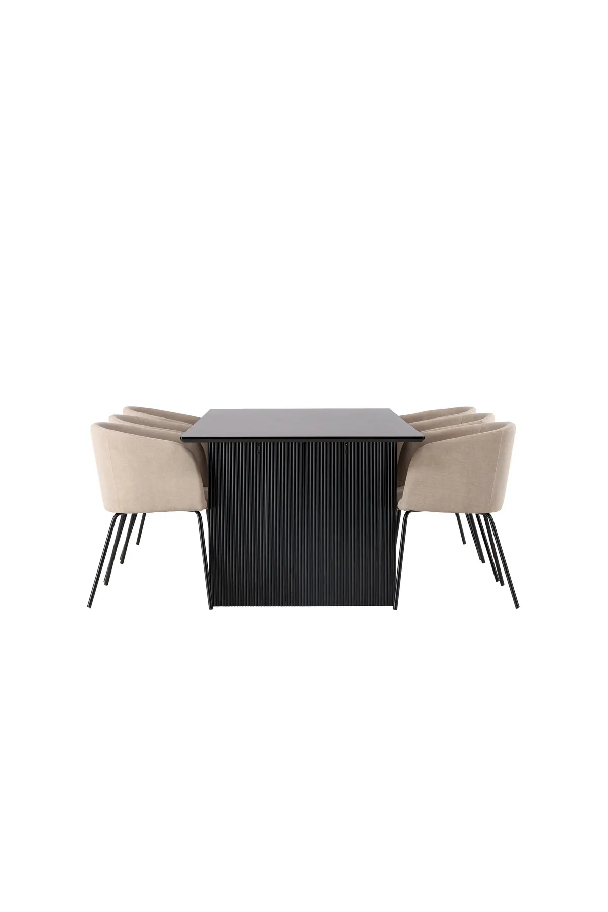Eine fantastische Essgruppe mit den richtigen Eigenschaften! Der rechteckige Esstisch Vail hat geradlinige nordische Formen und ist aus langlebigem MDF in rußschwarzer Farbe gefertigt. Die Tischplatte ist dünn und rechteckig und balanciert auf zwei stabilen Holzplatten, die das Untergestell bilden. Hier zusammen mit unseren bequemen Esszimmerstühlen Berit. Der Stuhl hat ein vollständig gepolstertes Design mit einer leicht abgerundeten Rückenlehne und Sitzfläche aus Polyster-Leinen und schmalen Beinen aus schwarzem Eisen. Hier erhalten Sie eine luxuriöse und einladende Essgruppe! Abmessungen des Tisches: 200x100cm.
