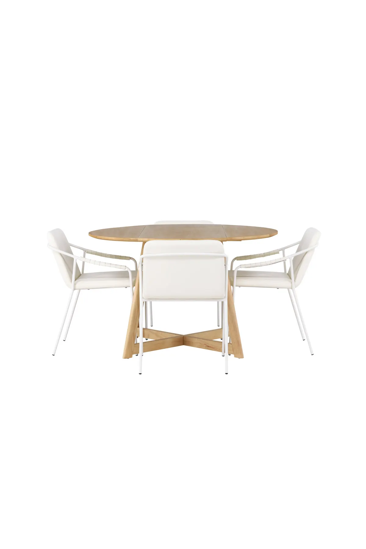 Der runde Esstisch Yakidon mit seiner eleganten Form und der raffinierten Tischplatte wird schnell zu einem Lieblingsstück in Ihrem Zuhause, das Sie ganz nach Ihren Wünschen gestalten können. Die beiden klappbaren Enden geben Ihnen die Flexibilität, mehr Gäste zu beherbergen oder bei Bedarf zusätzlichen Platz zu schaffen. Die leicht ausgestellten Beine bilden ein schönes Kreuzmuster auf dem Boden und verleihen dem Tisch einen modernen und trendigen Touch. Hergestellt aus hochwertigem MDF mit eichenähnlicher Oberfläche und Gummibaum.